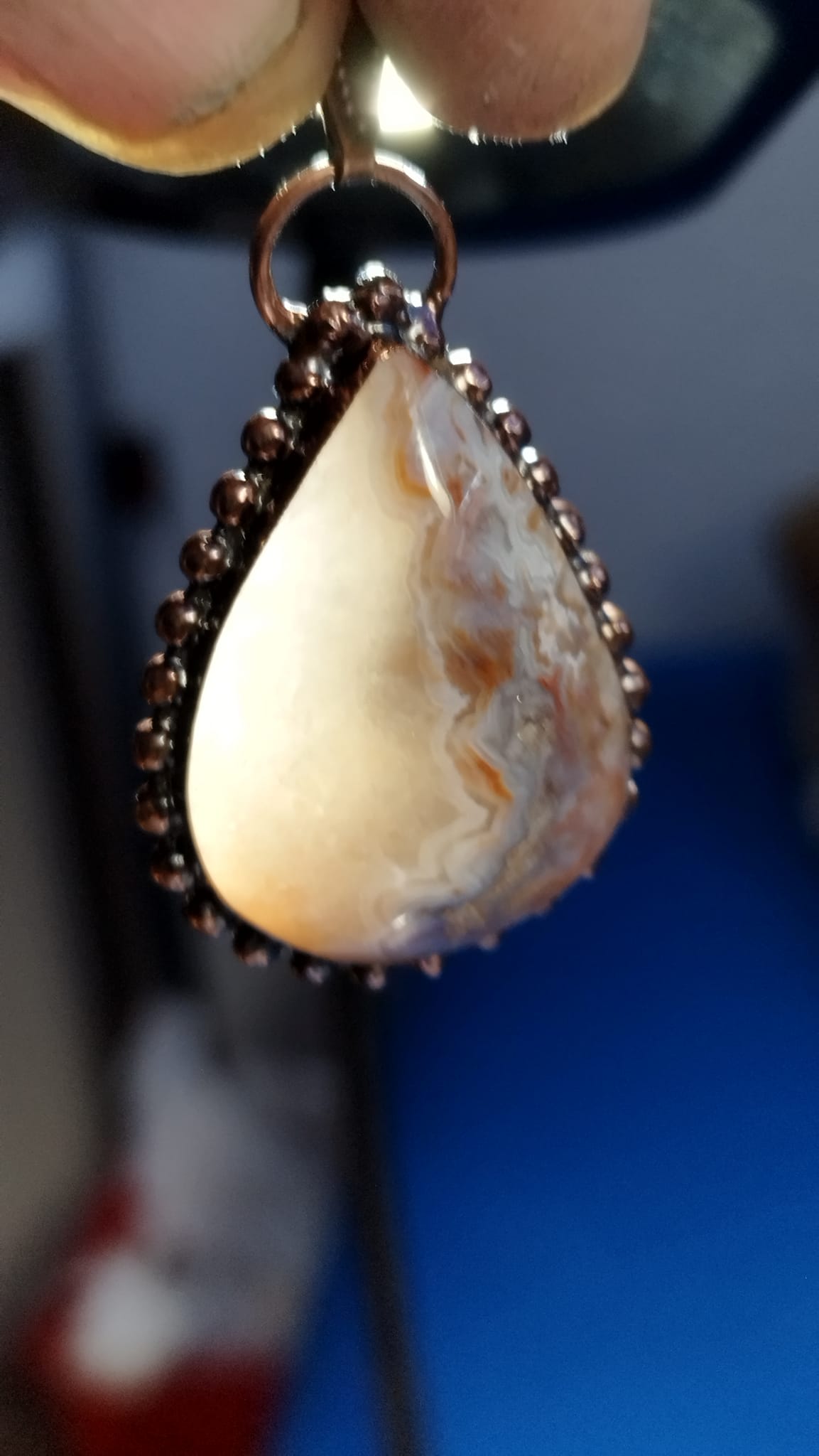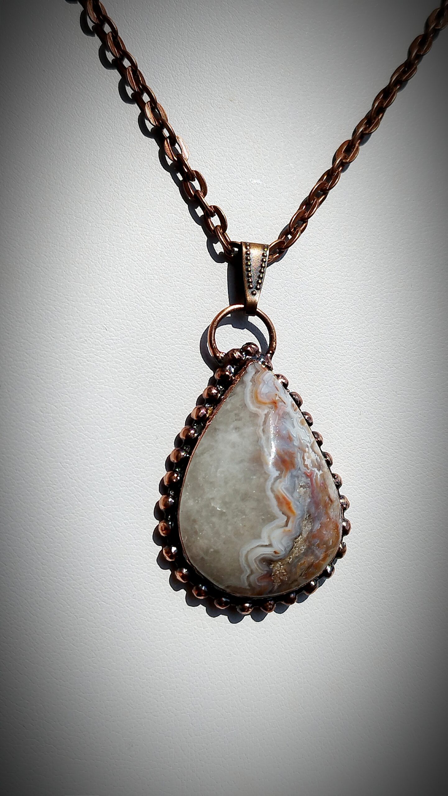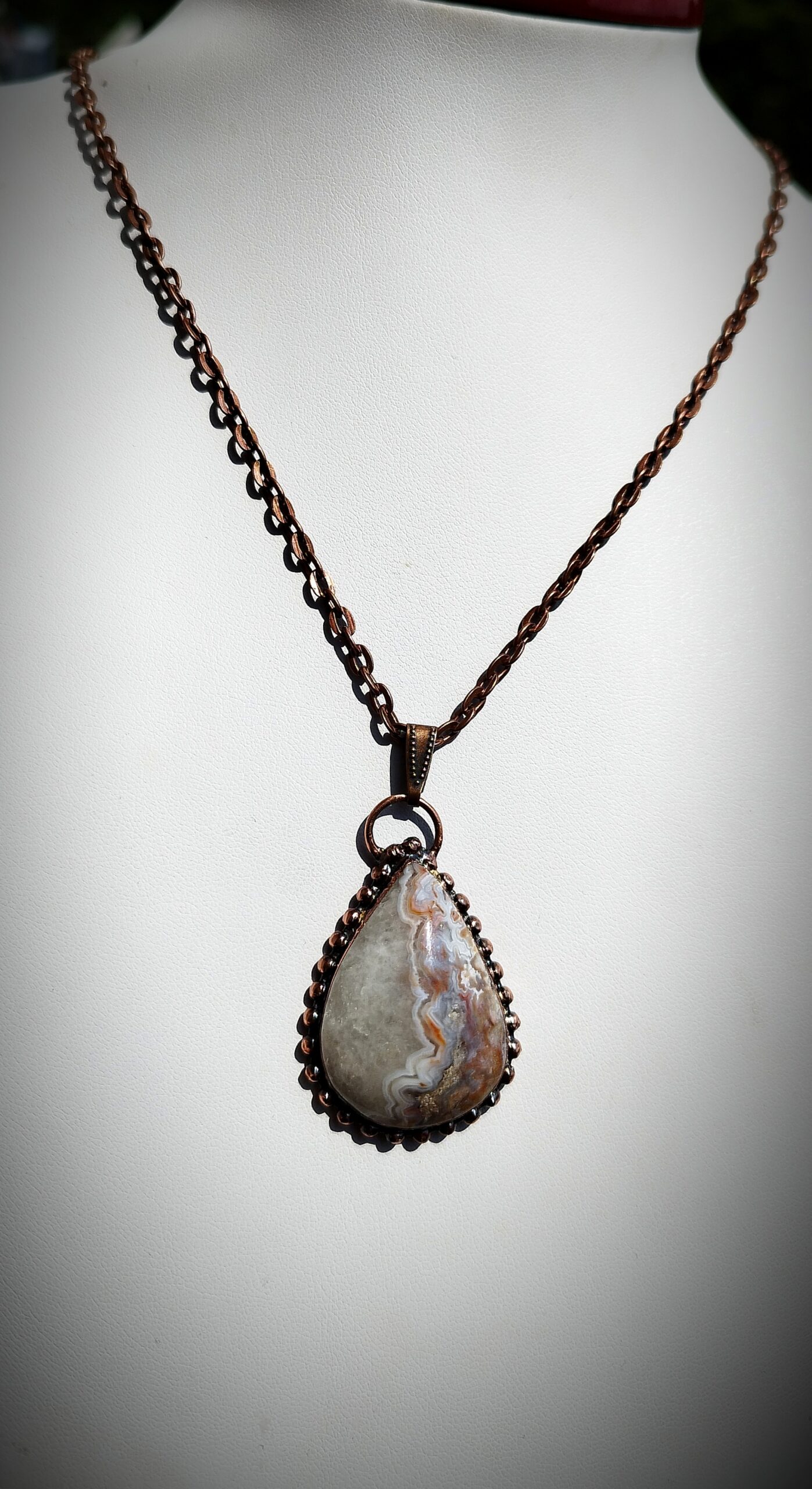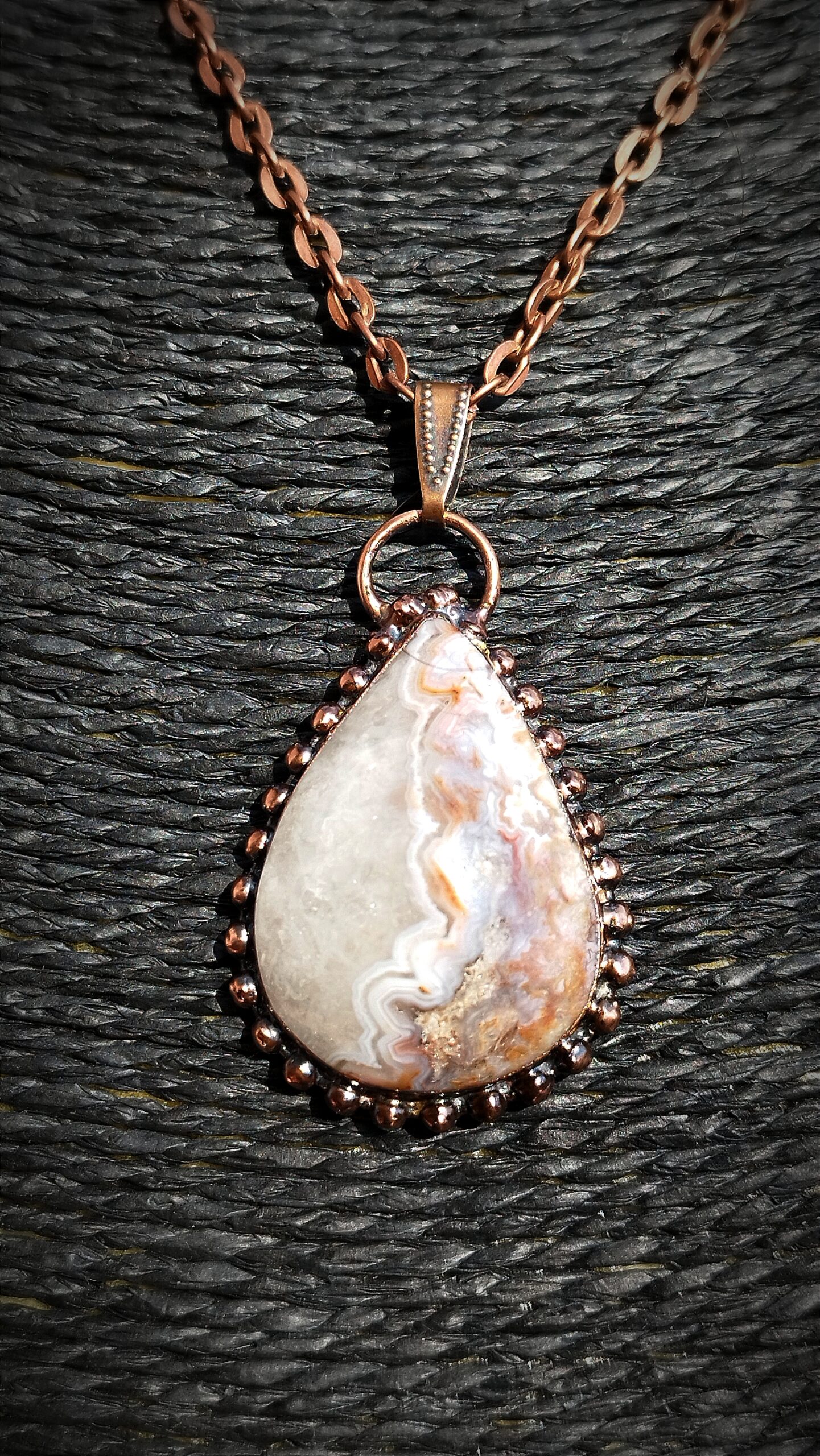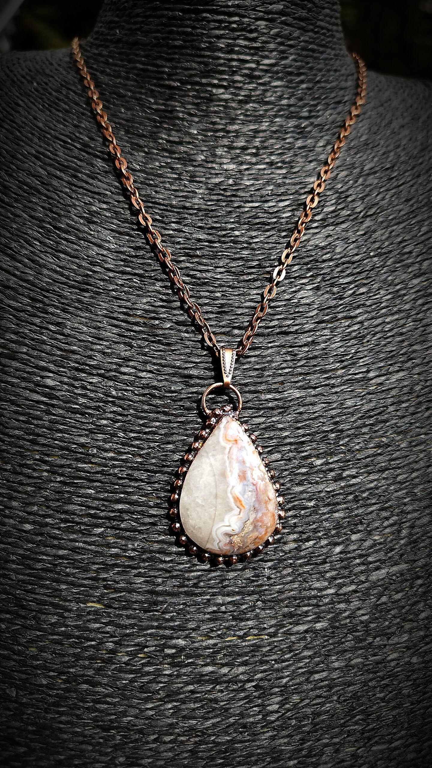 Originální talisman s přírodním kamenem Achát Crazy z Mexika, vytvořený technikou galvanoplastiky (electroforming) v mědi. Každý kus je ručně vyráběný originál z autorské dílny Sirius.