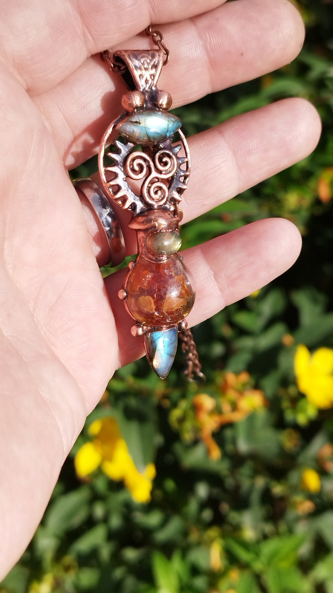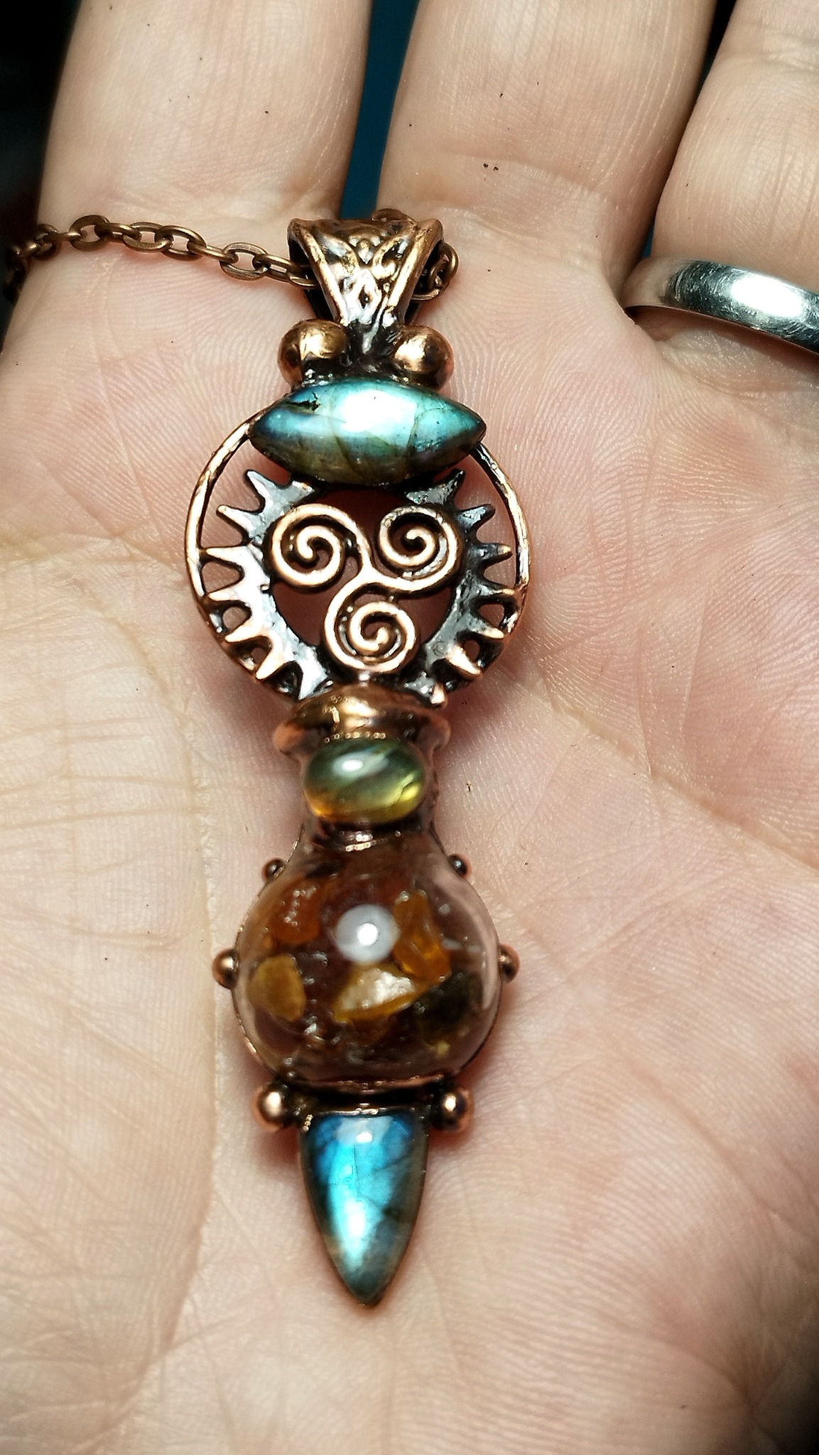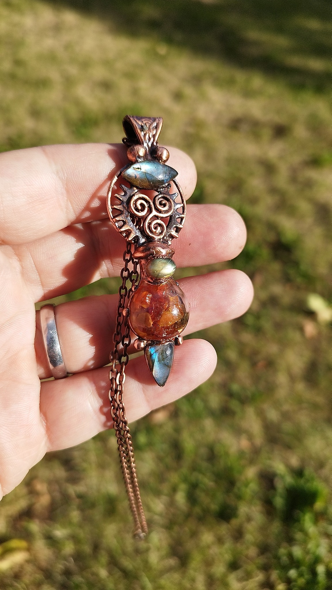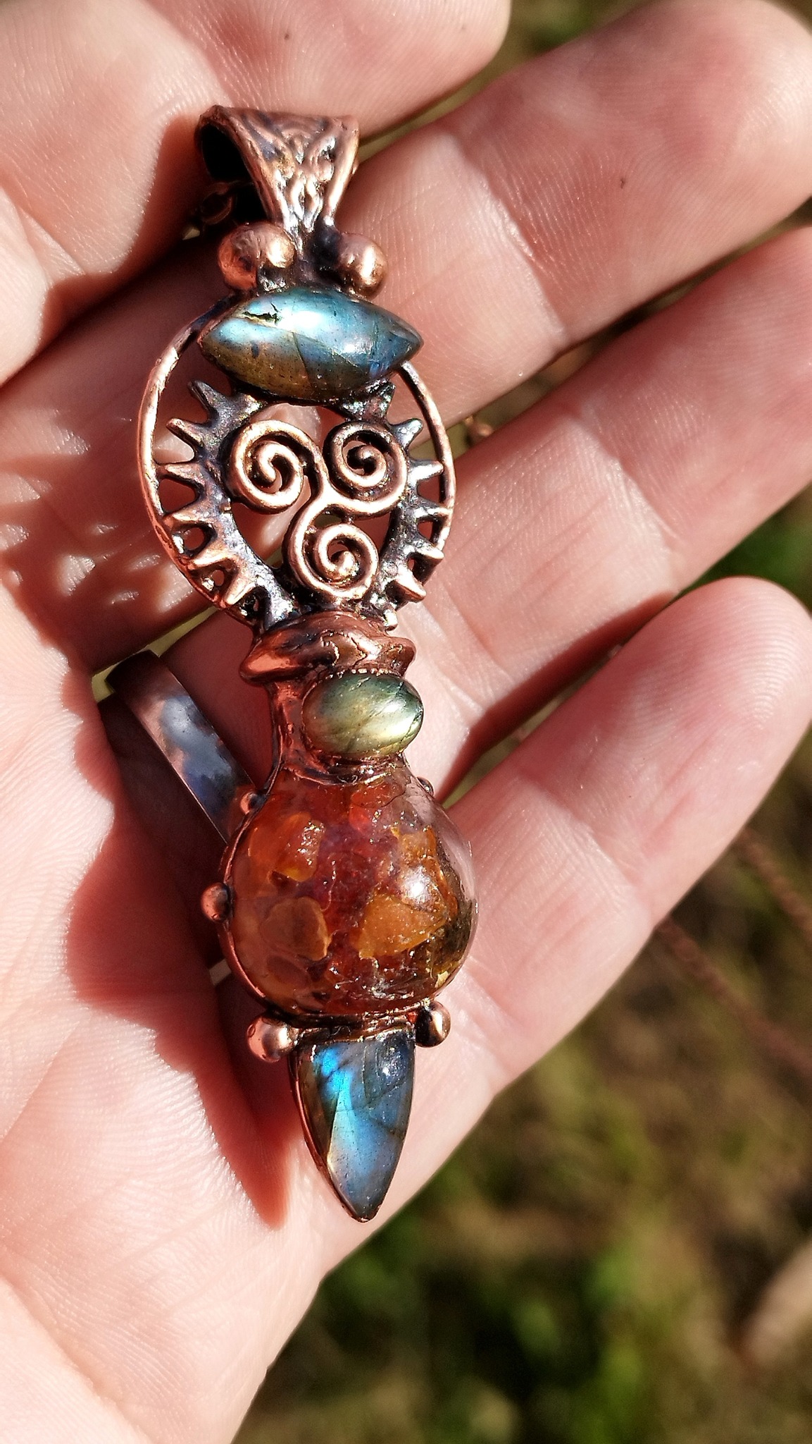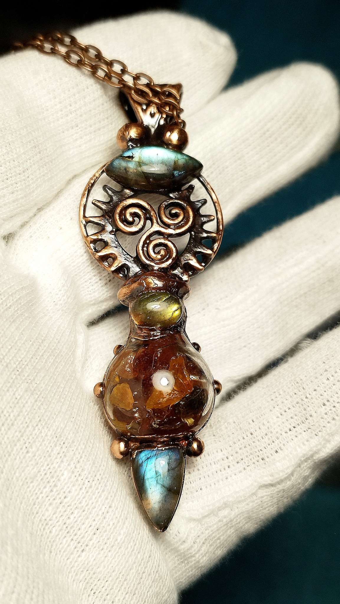 Materiál: měď, labradorit, jantar
