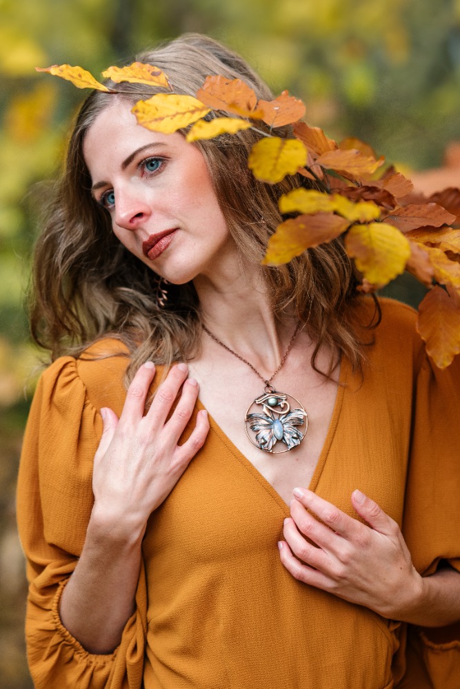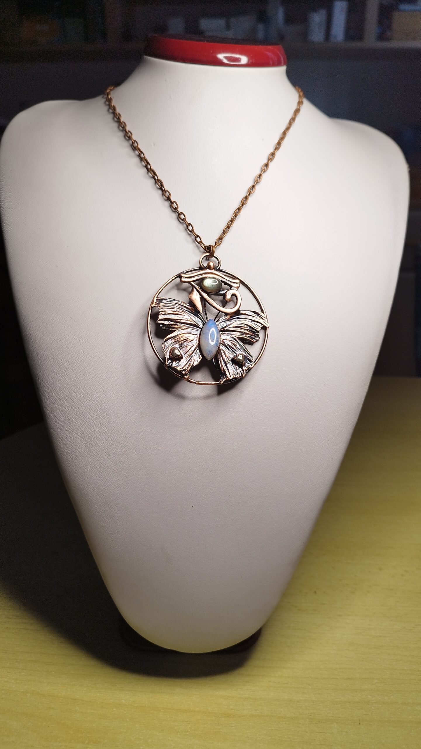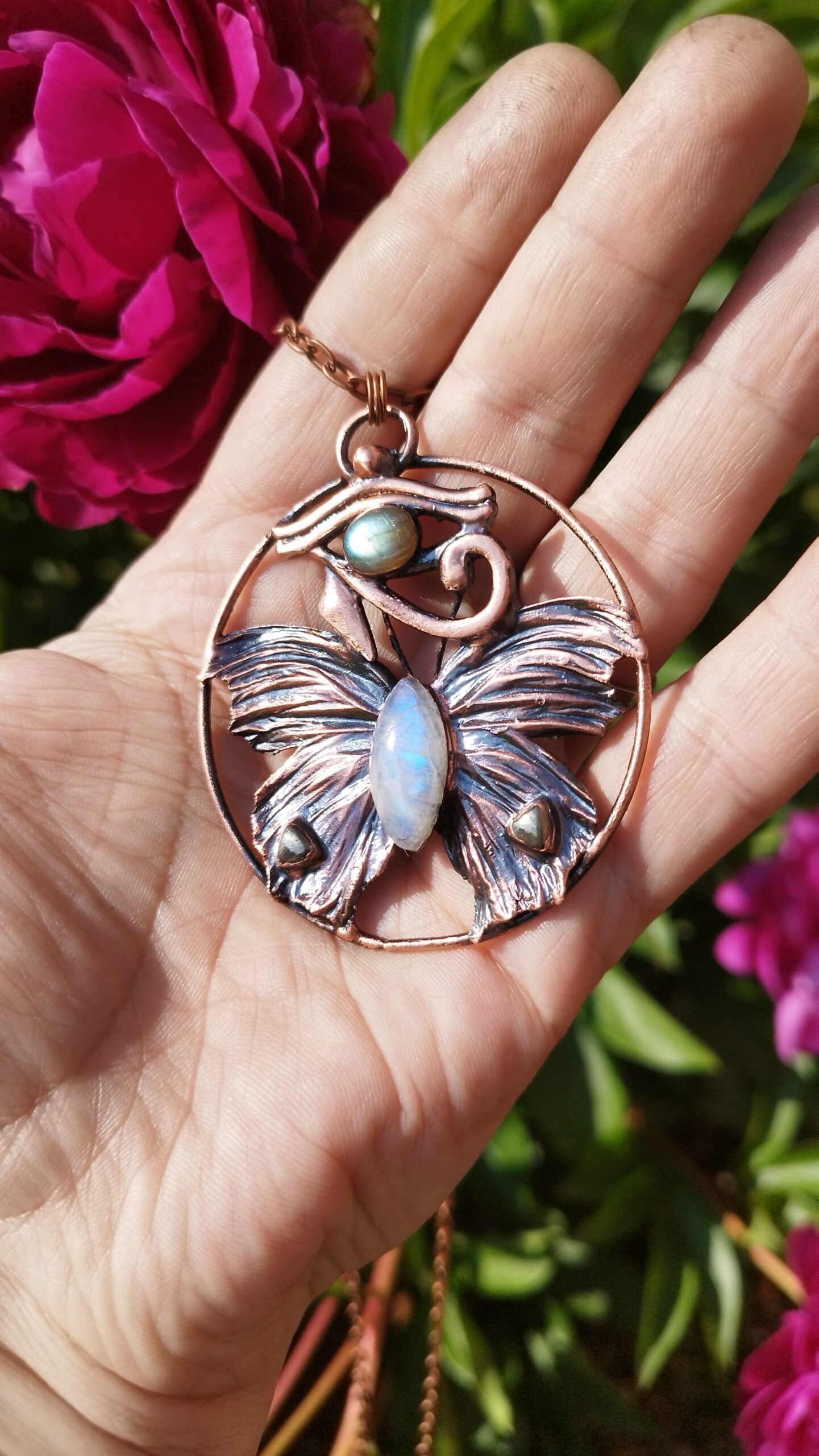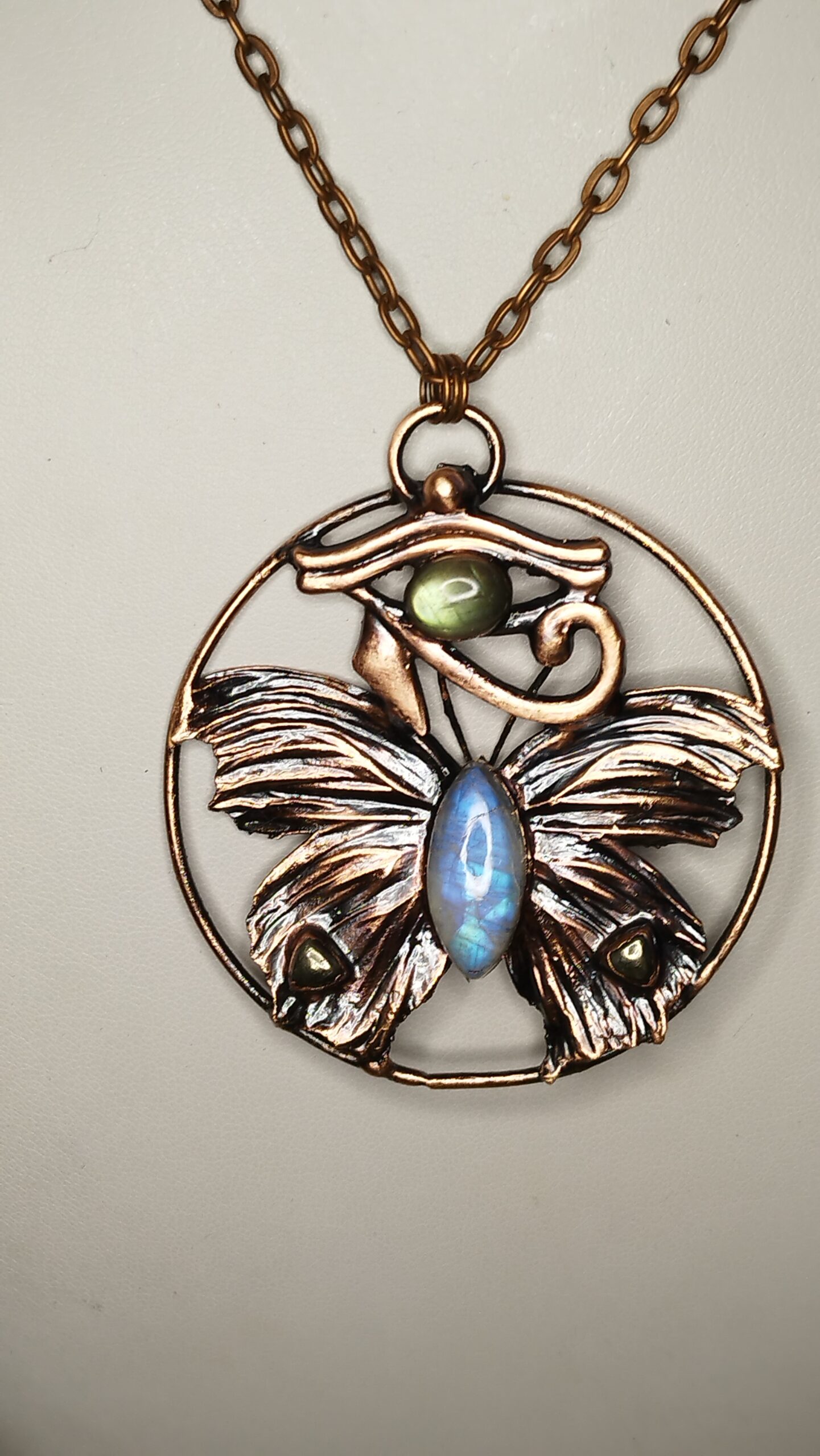Představujeme talisman Let mezi světy, jedinečný autorský šperk vytvořený metodou galvanoplastiky, která umožňuje zachovat přírodní motivy v měděném objetí. Základem je skutečný motýlí skelet, doplněný labradoritem, měsíčním kamenem a ochranným symbolem Horova oka.