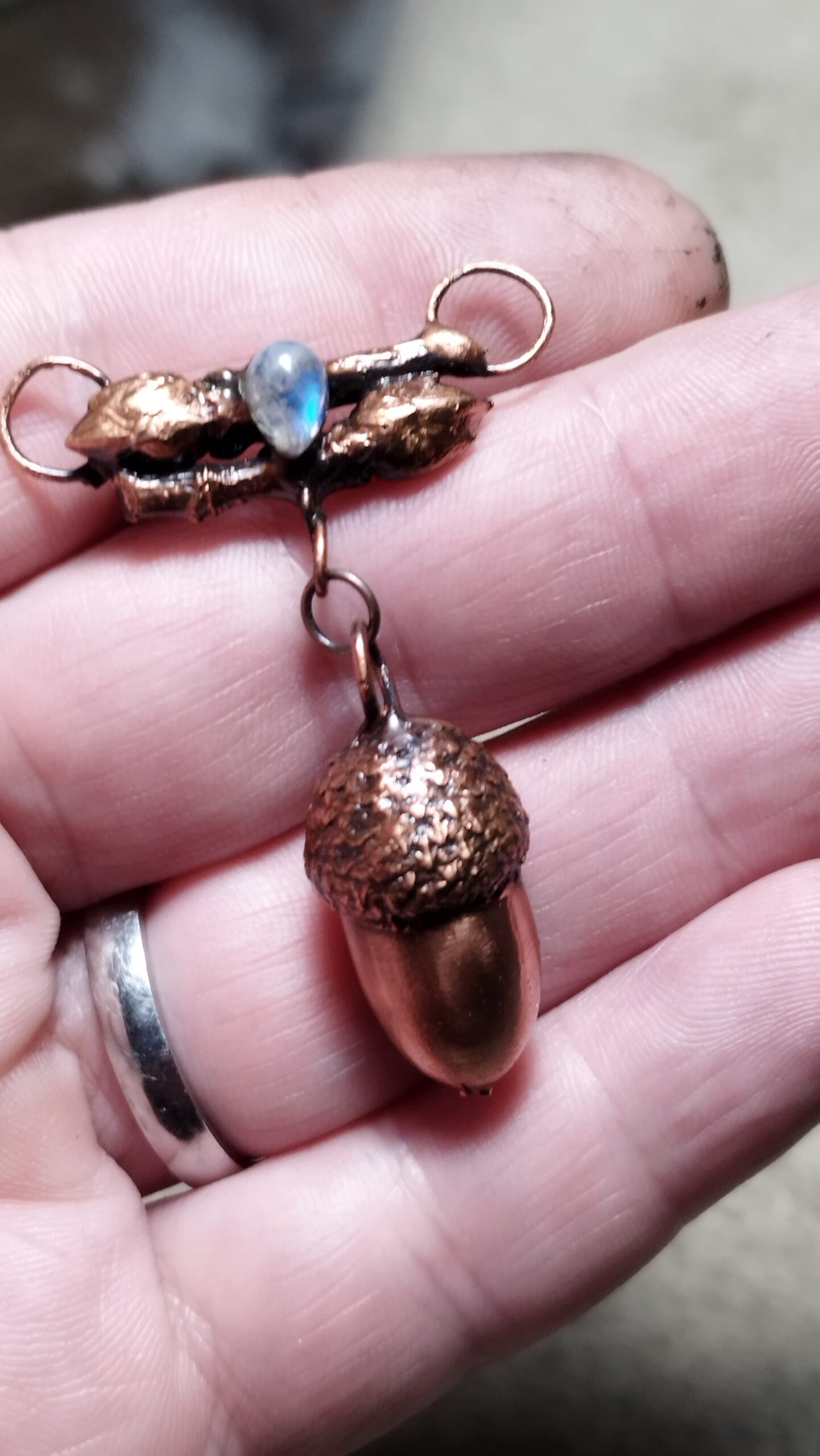 Dominantou tohoto šperku je autentický žalud pokovený mědí, symbol síly, růstu a nových začátků. Žalud je odpradávna považován za talisman prosperity a vitality, představující nekonečný potenciál a energii k růstu. Doplněn je o drobné větvičky s poupátky, které dotváří celkovou harmonii a propojení s přírodou.