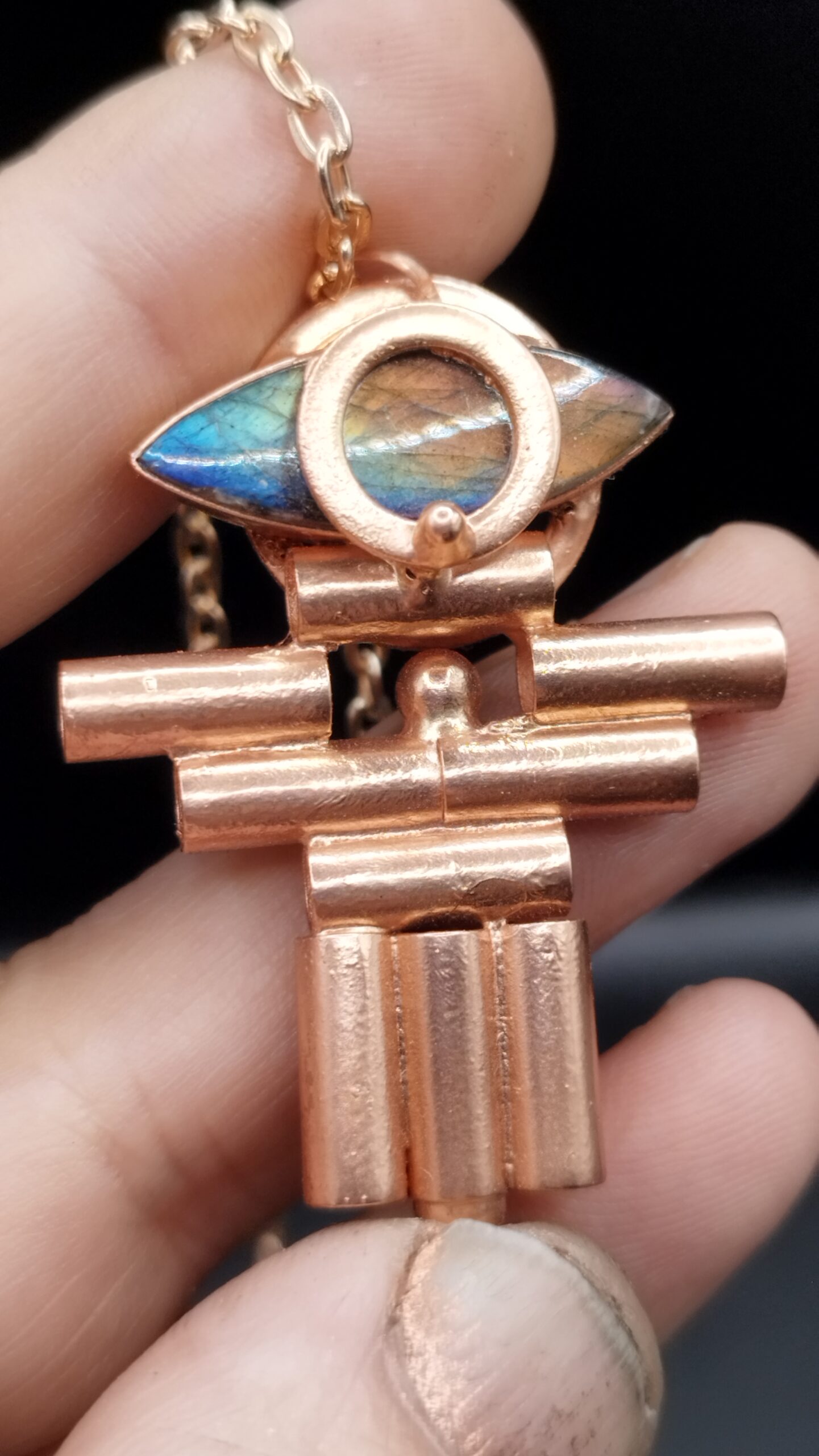 Tento ručně vyráběný měděný talisman s labradoritem vznikl technikou galvanoplastiky jako jedinečný osobní artefakt.