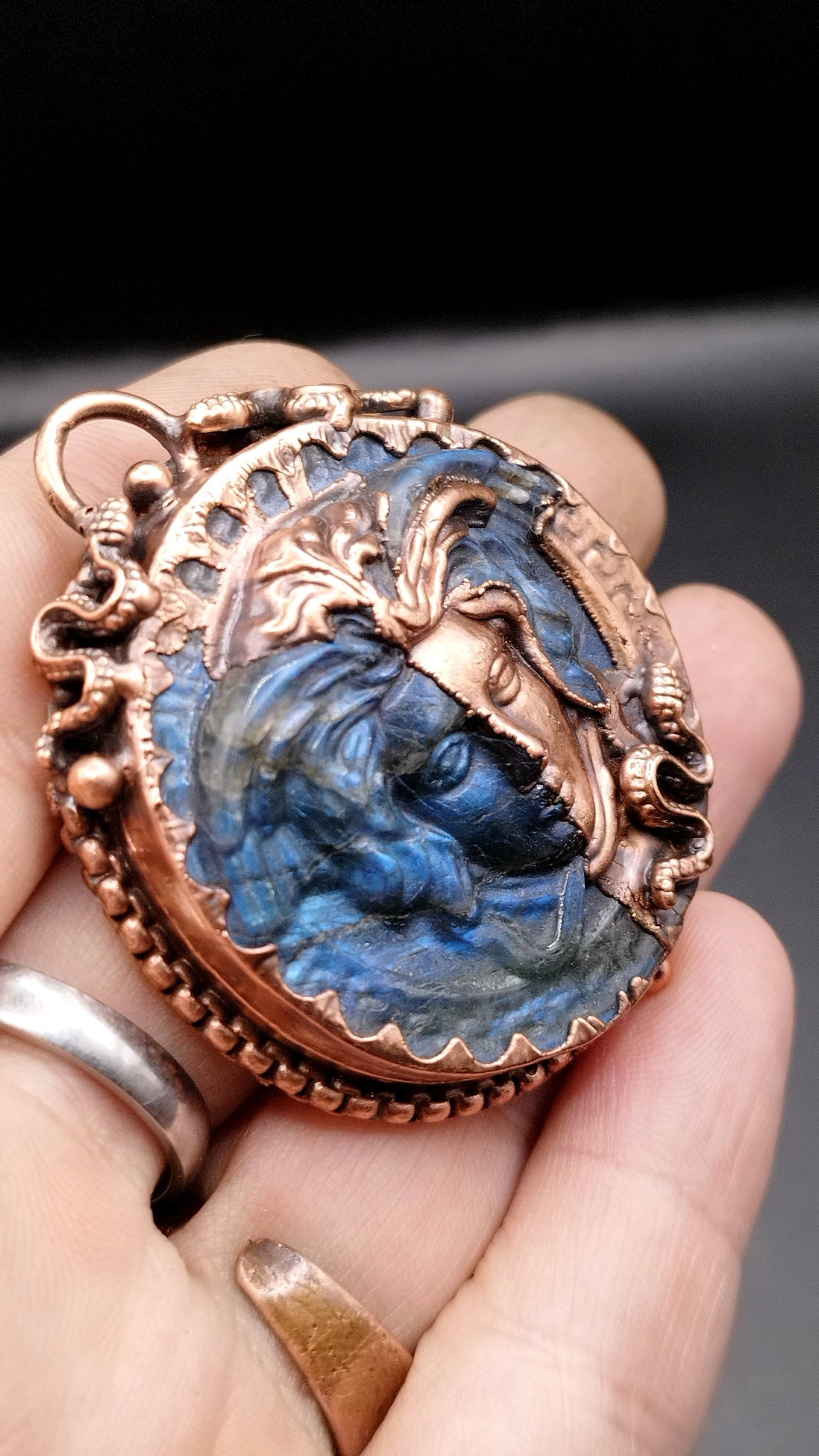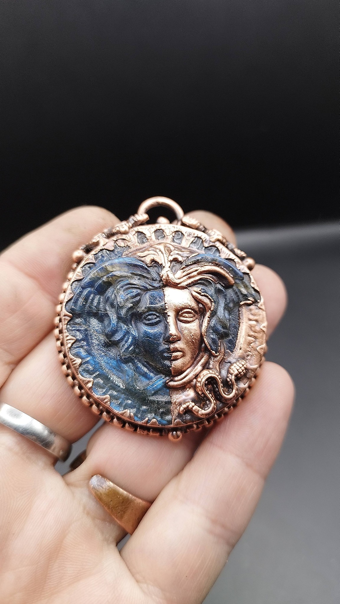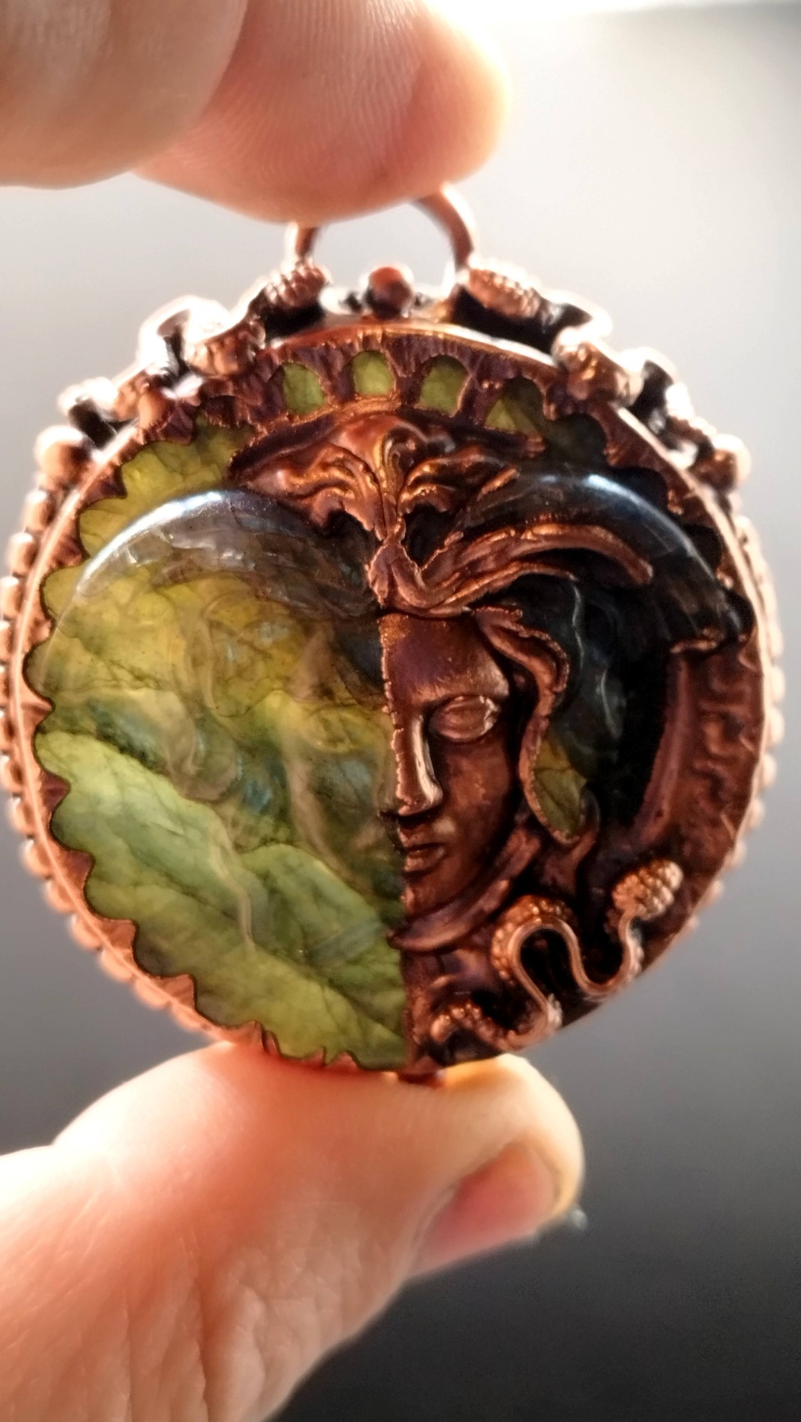 Labradoritový talisman „Medúza“ – ochranný měděný přívěsek (galvanoplastika)