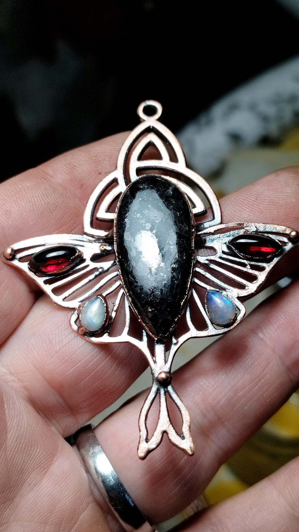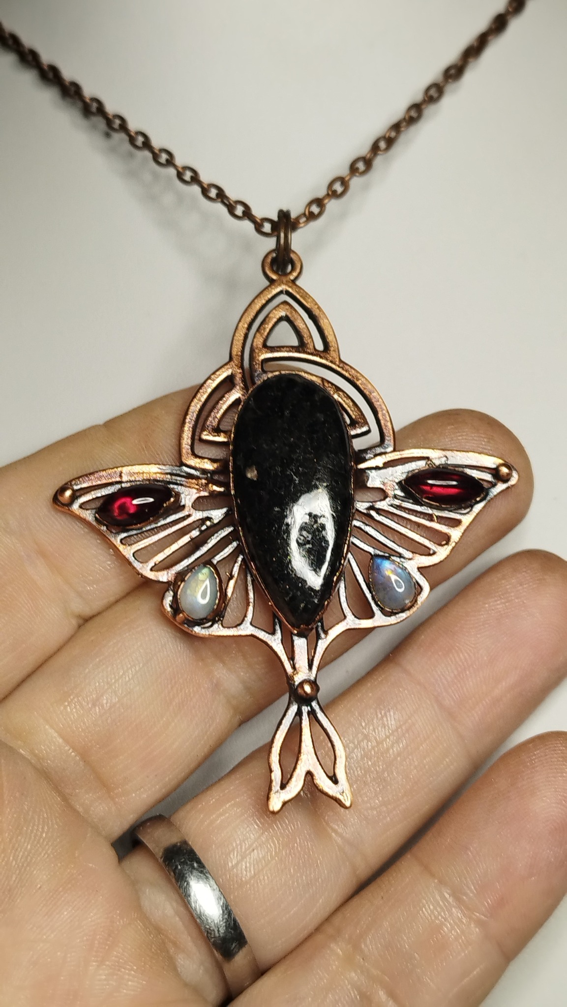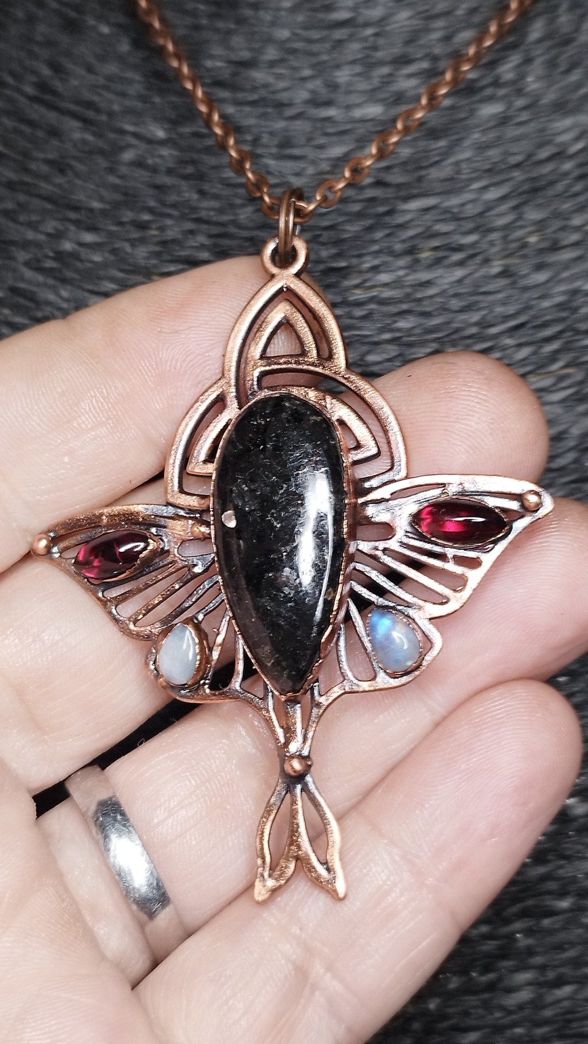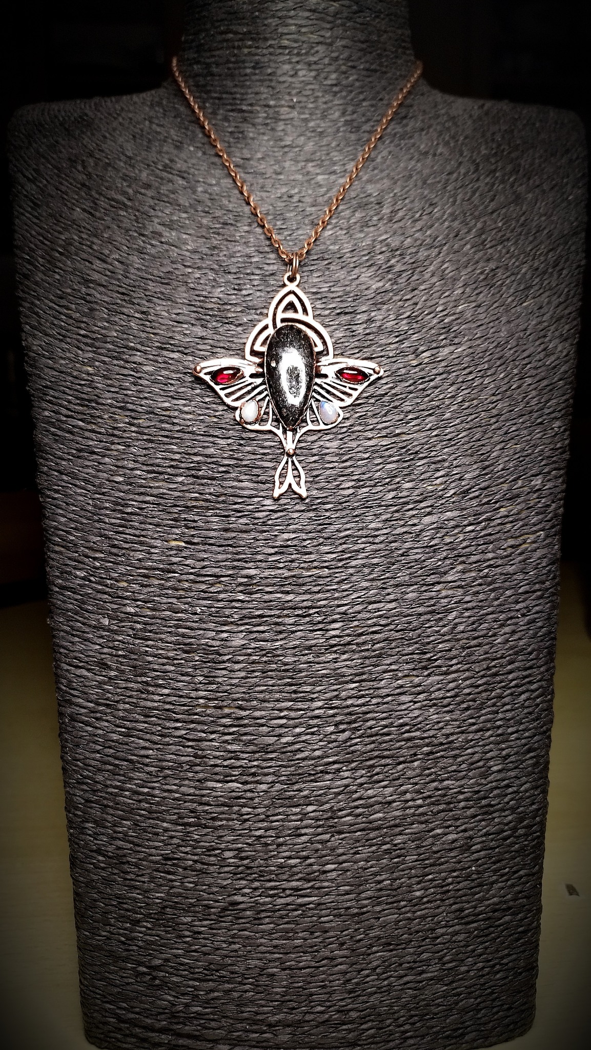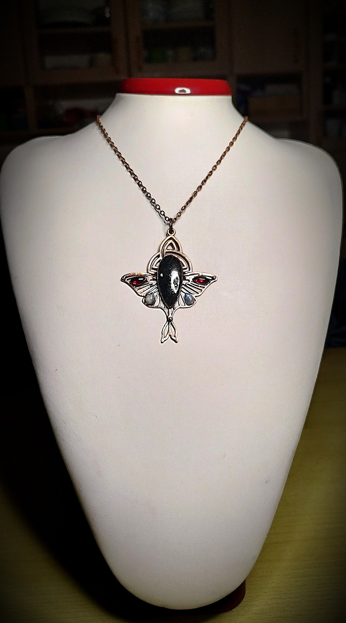 Křídla můří bohyně zdobí dva granáty 🔥 – kameny životní síly, vášně, odvahy a ochrany, a dva měsíční kameny 🌙, které otevírají bránu intuici, ženské energii a vnitřní harmonii. Tato kombinace přináší rovnováhu mezi aktivní a pasivní energií – mezi odvahou jednat a moudrostí naslouchat.