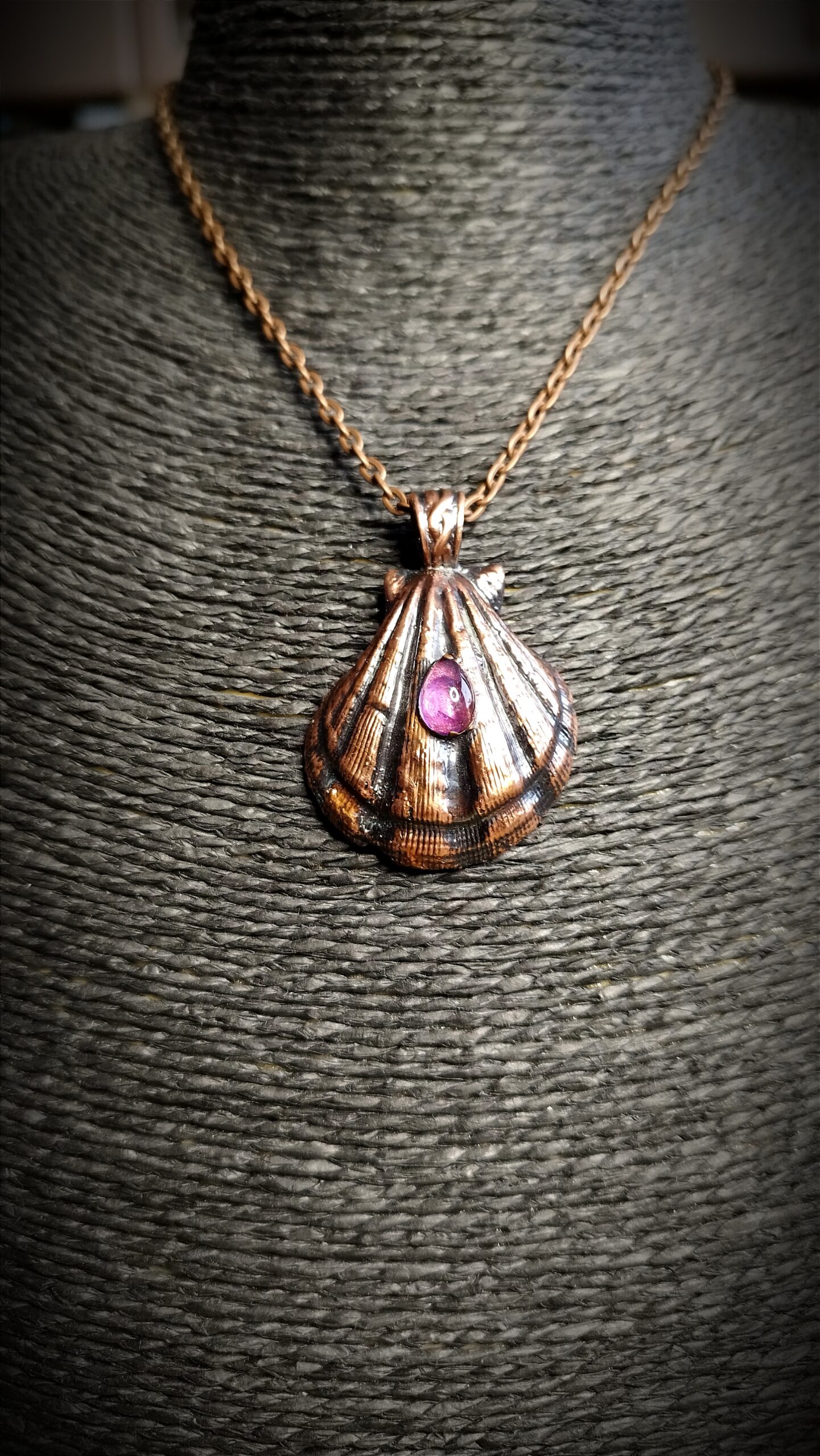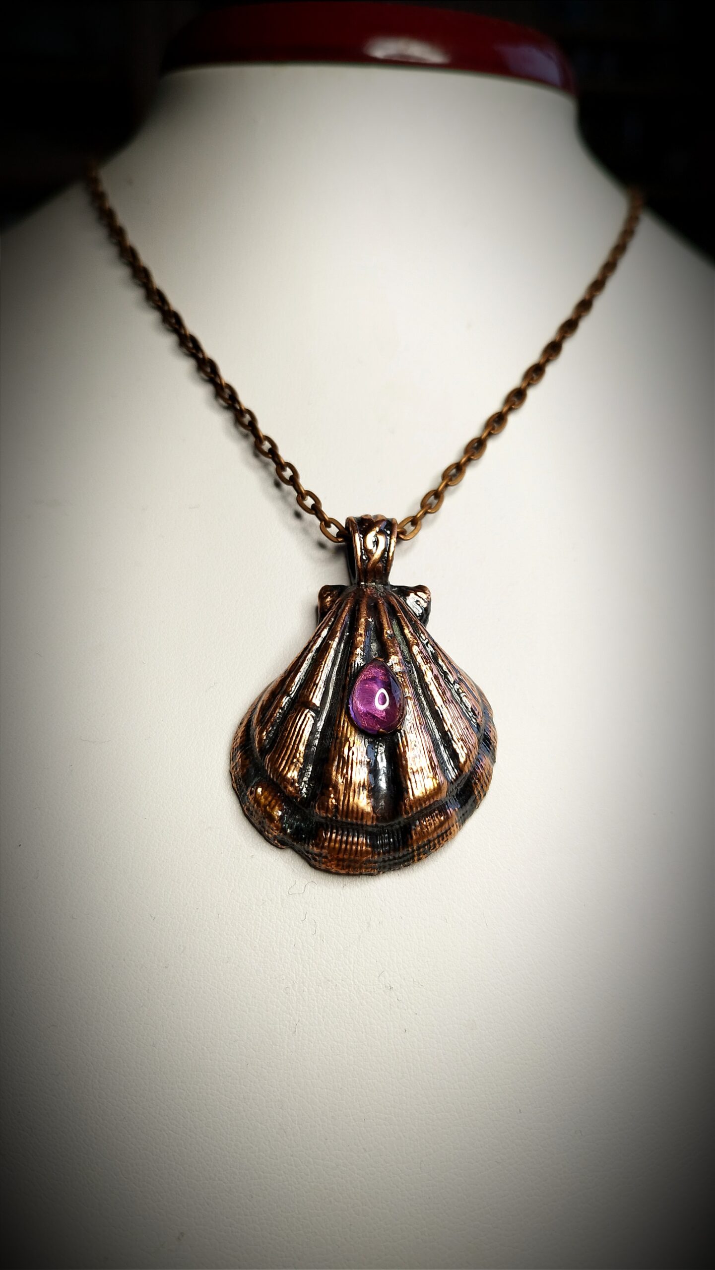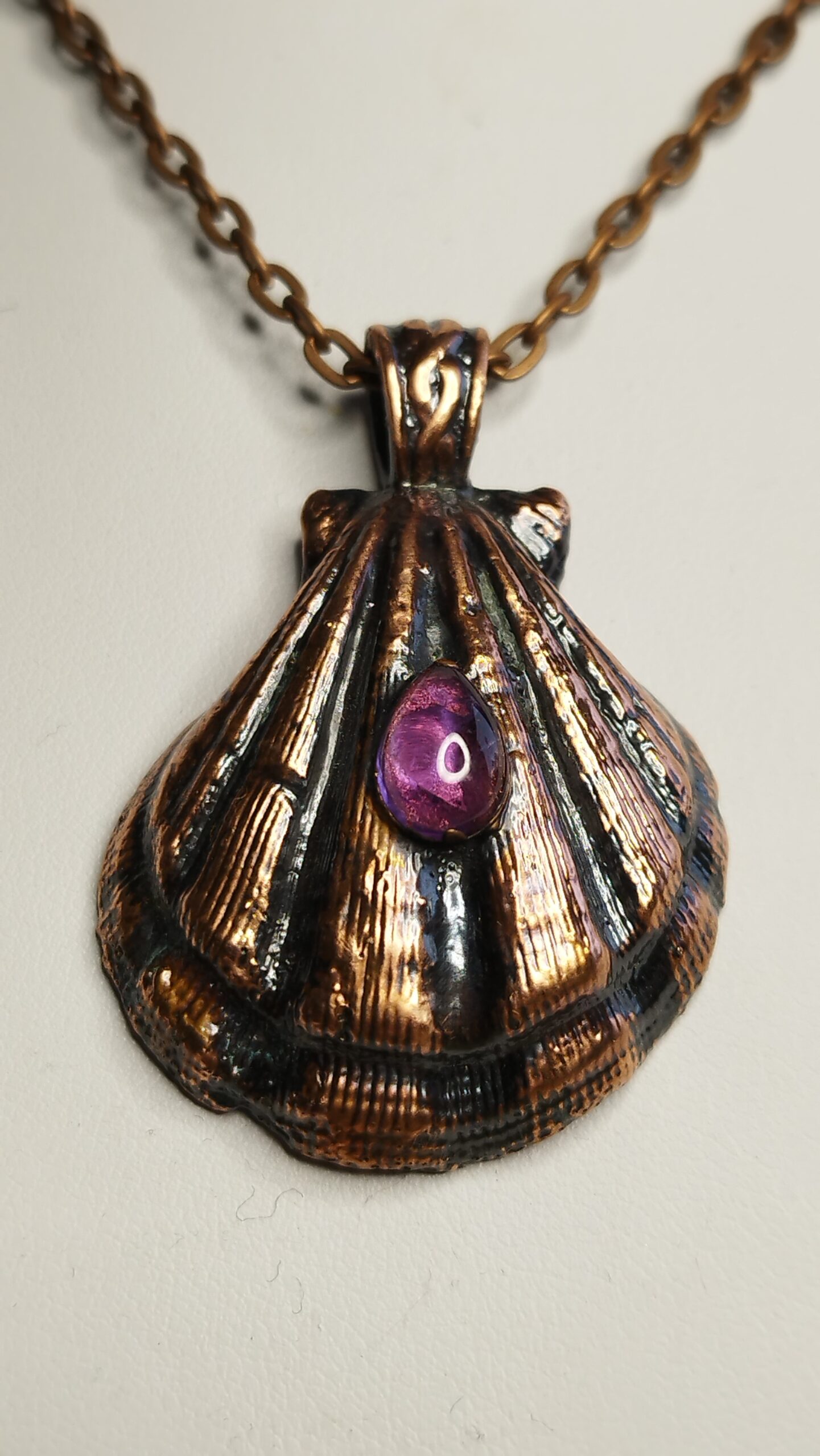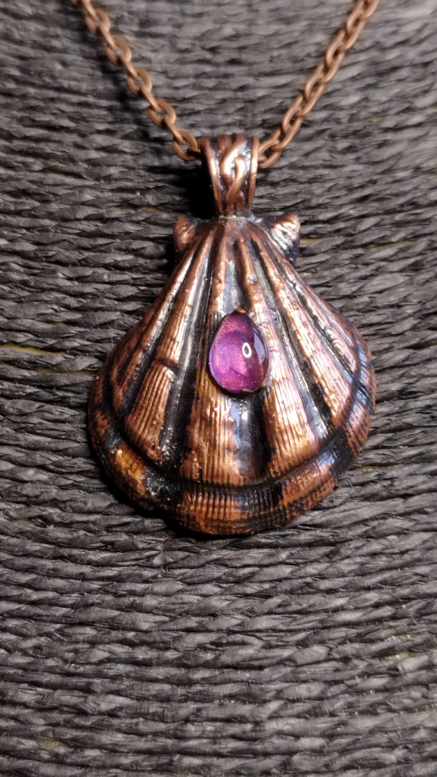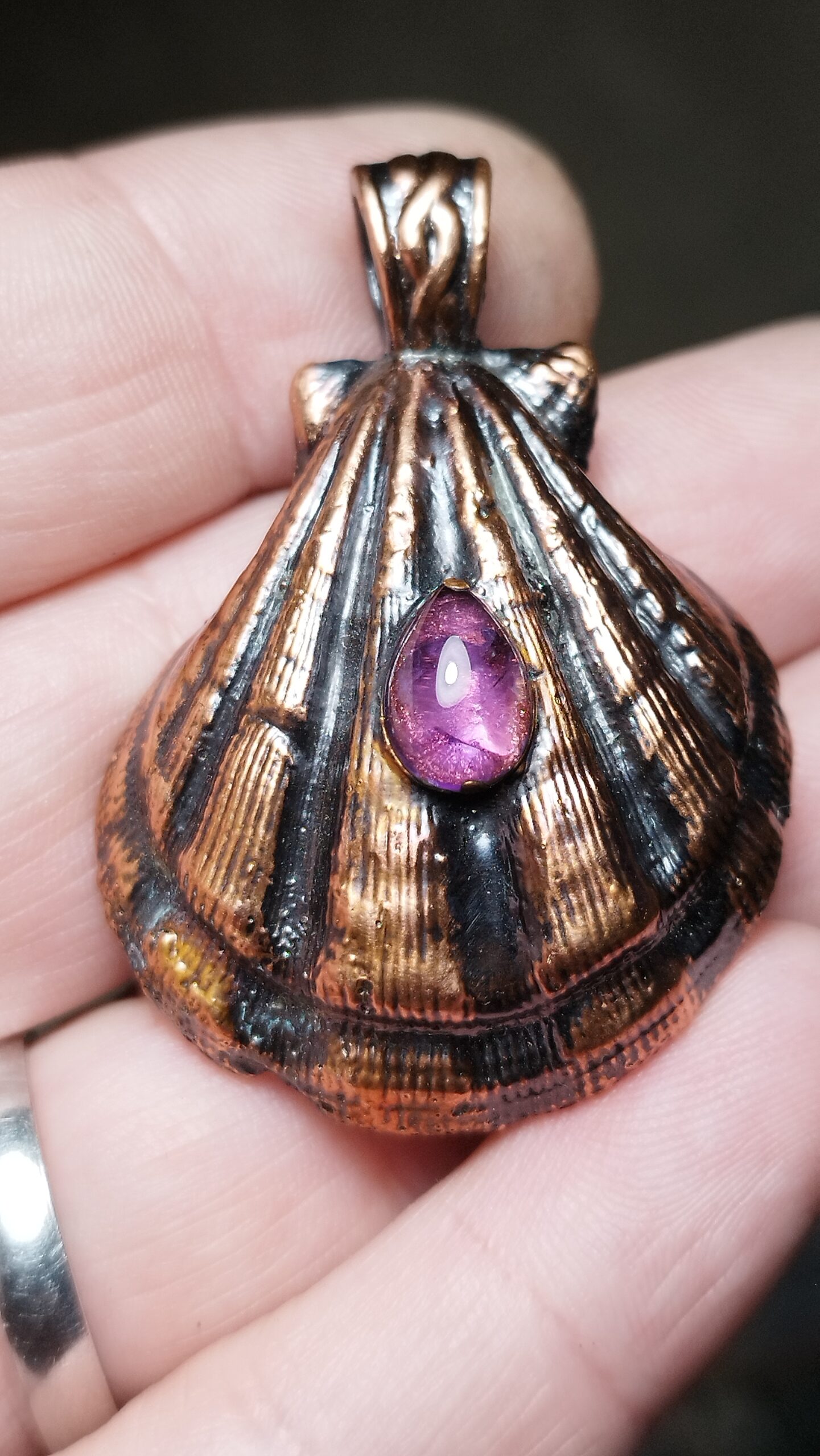 Z dílny Sirius přichází jedinečný talisman, který spojuje krásu přírody s uměleckou precizností. Tento talisman je vytvořen z autentické mořské mušle, která byla pokovena mědí metodou elektroformingu. Jeho středobodem je kapka ametystu, jež do něj vnáší duchovní energii a ochranu.