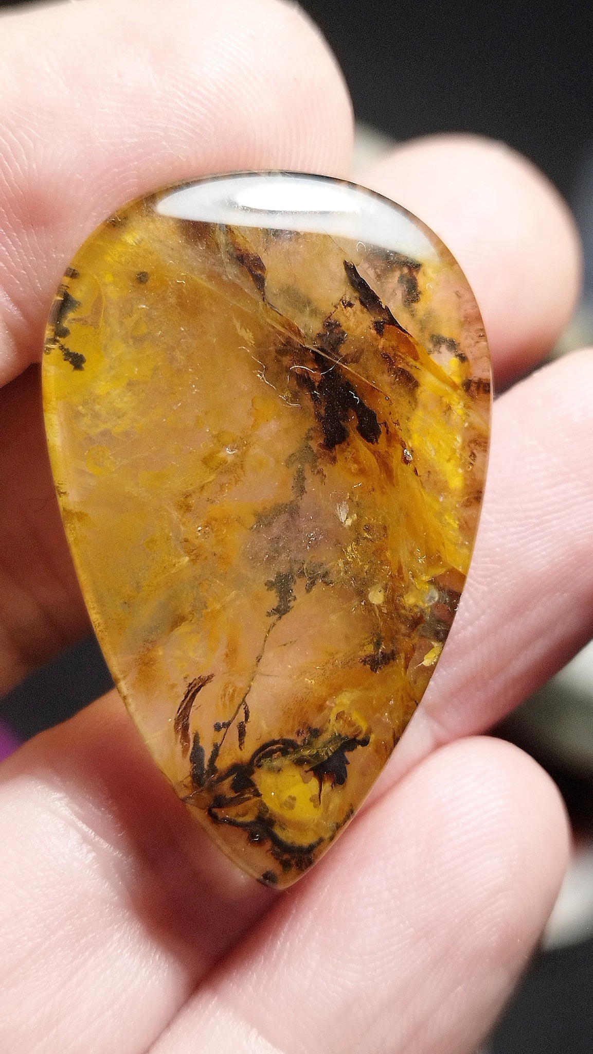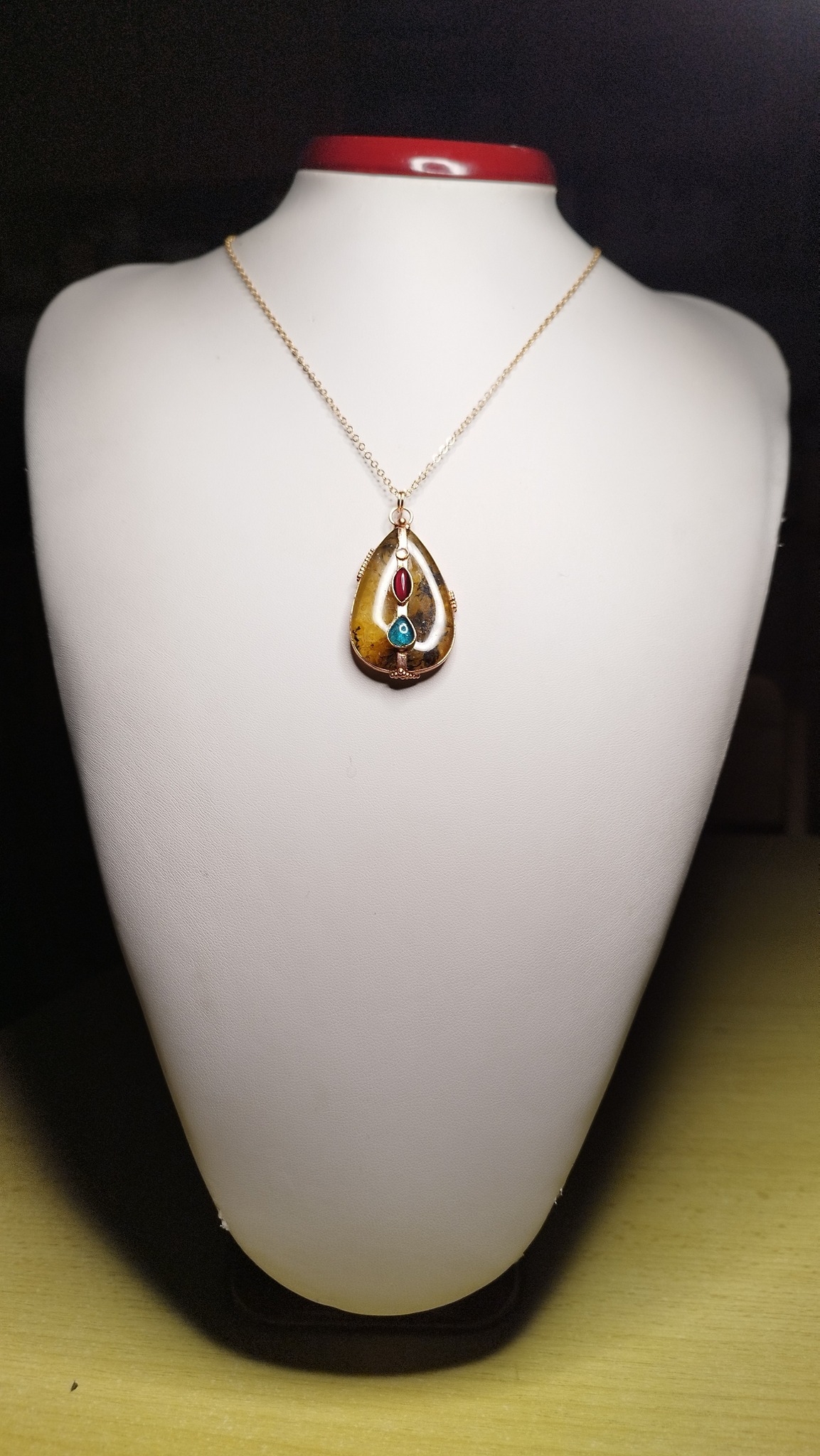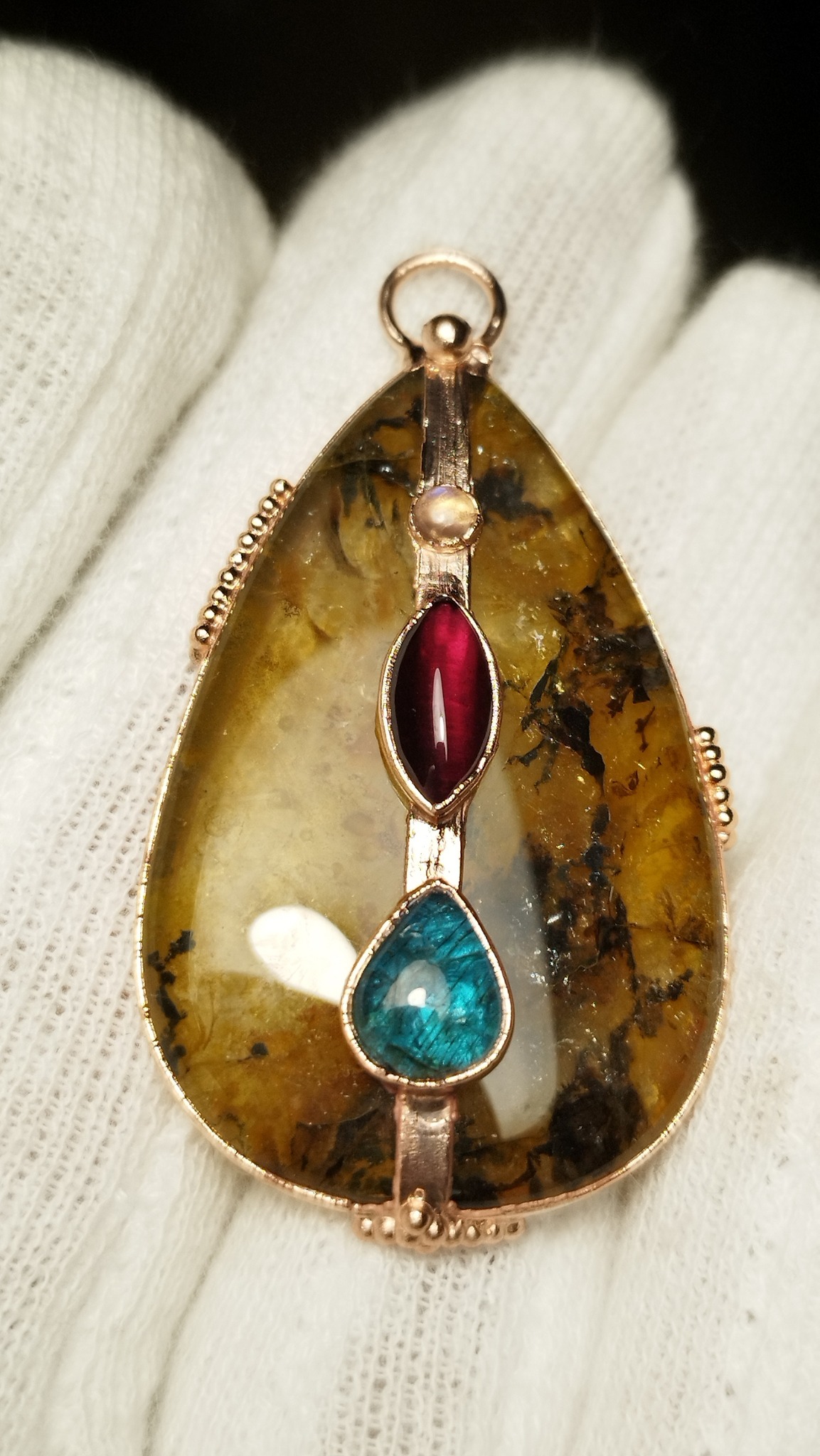 Talisman je vytvořen z křemene s minerálními inkluzemi, měsíčního kamene, granátu a apatitu a zasazen do mědi.