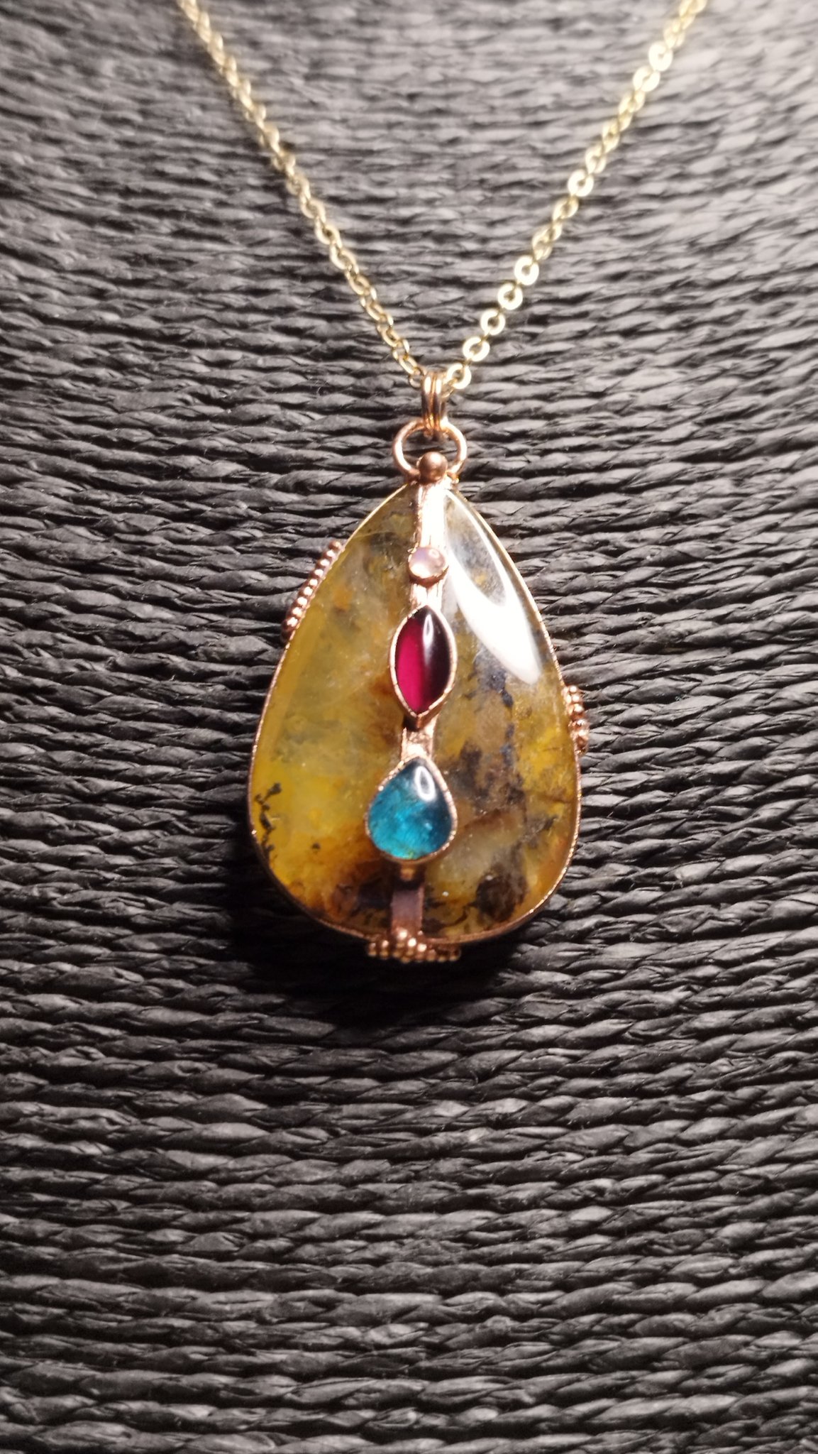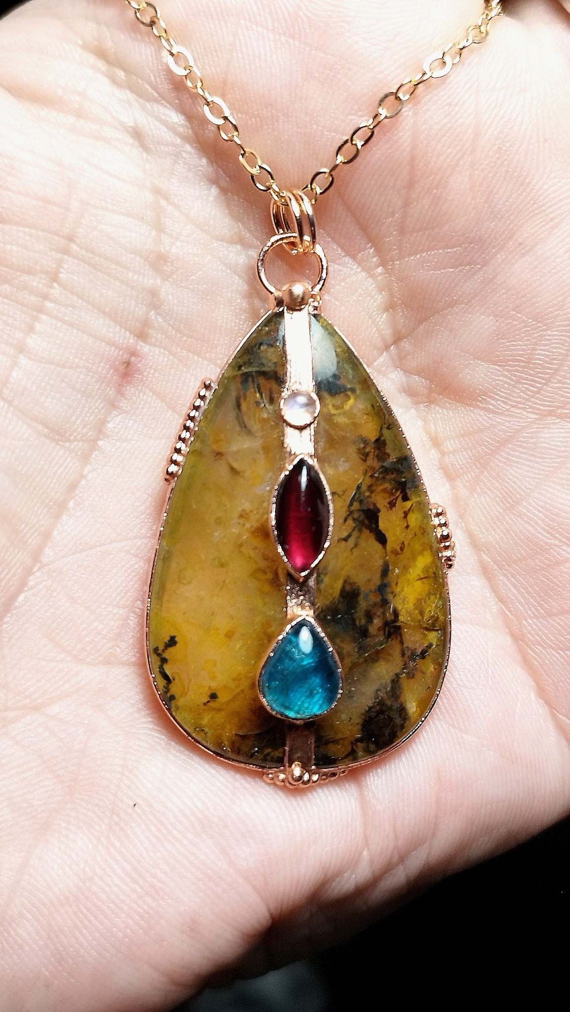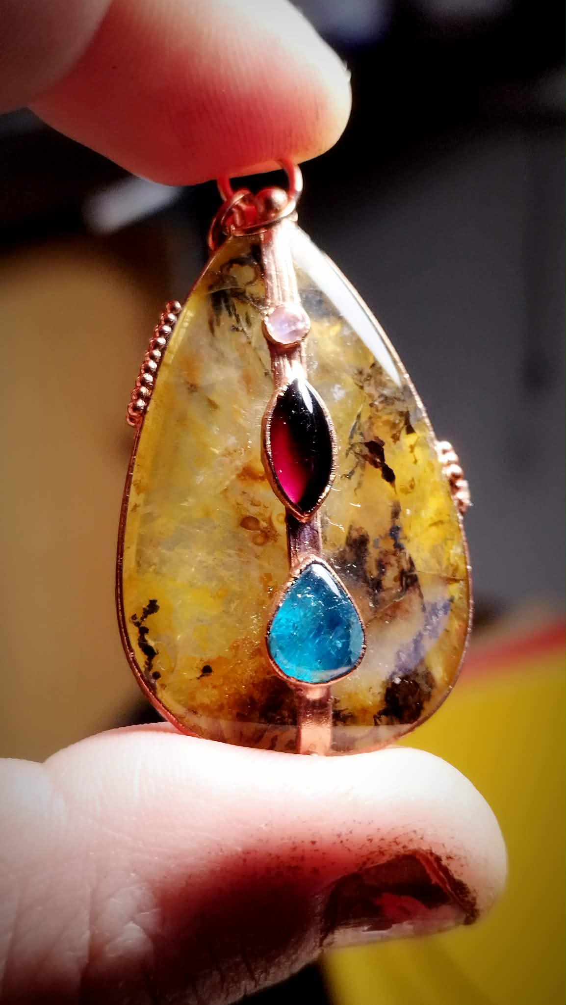 Tento ručně vyráběný přívěsek „Srdce země“ je jedinečný talisman z křemene s minerálními inkluzemi, doplněný měsíčním kamenem, granátem a apatitem. Celý šperk je zasazen do mědi, která je od pradávna vnímána jako vodič a zesilovač energie přírodních kamenů.