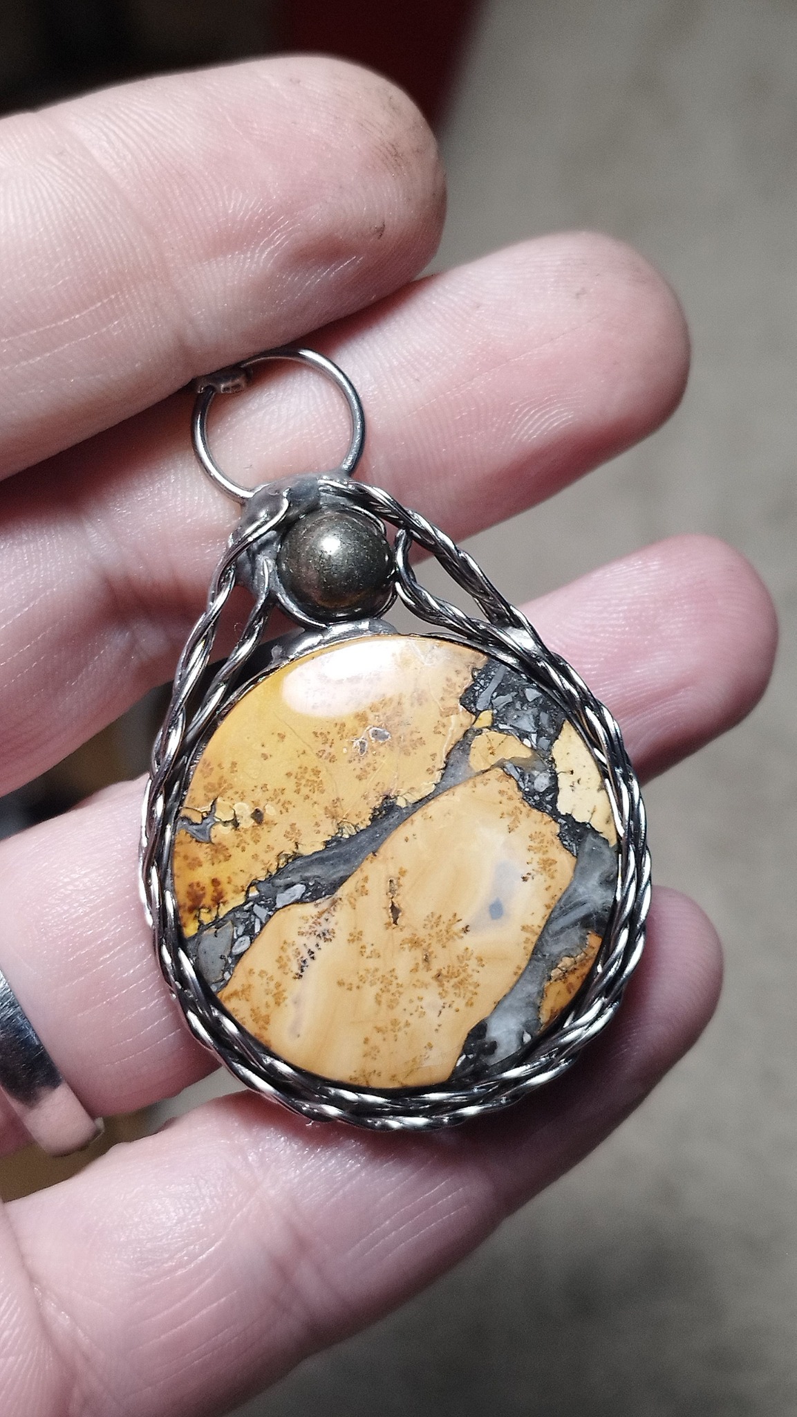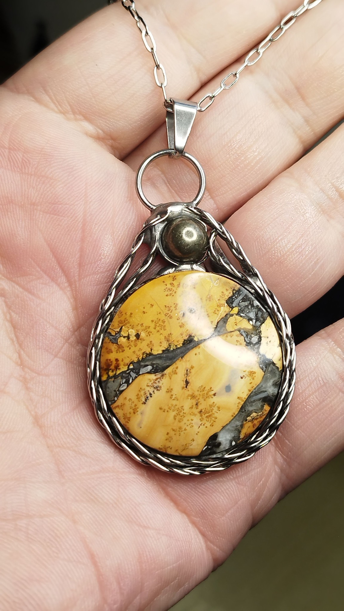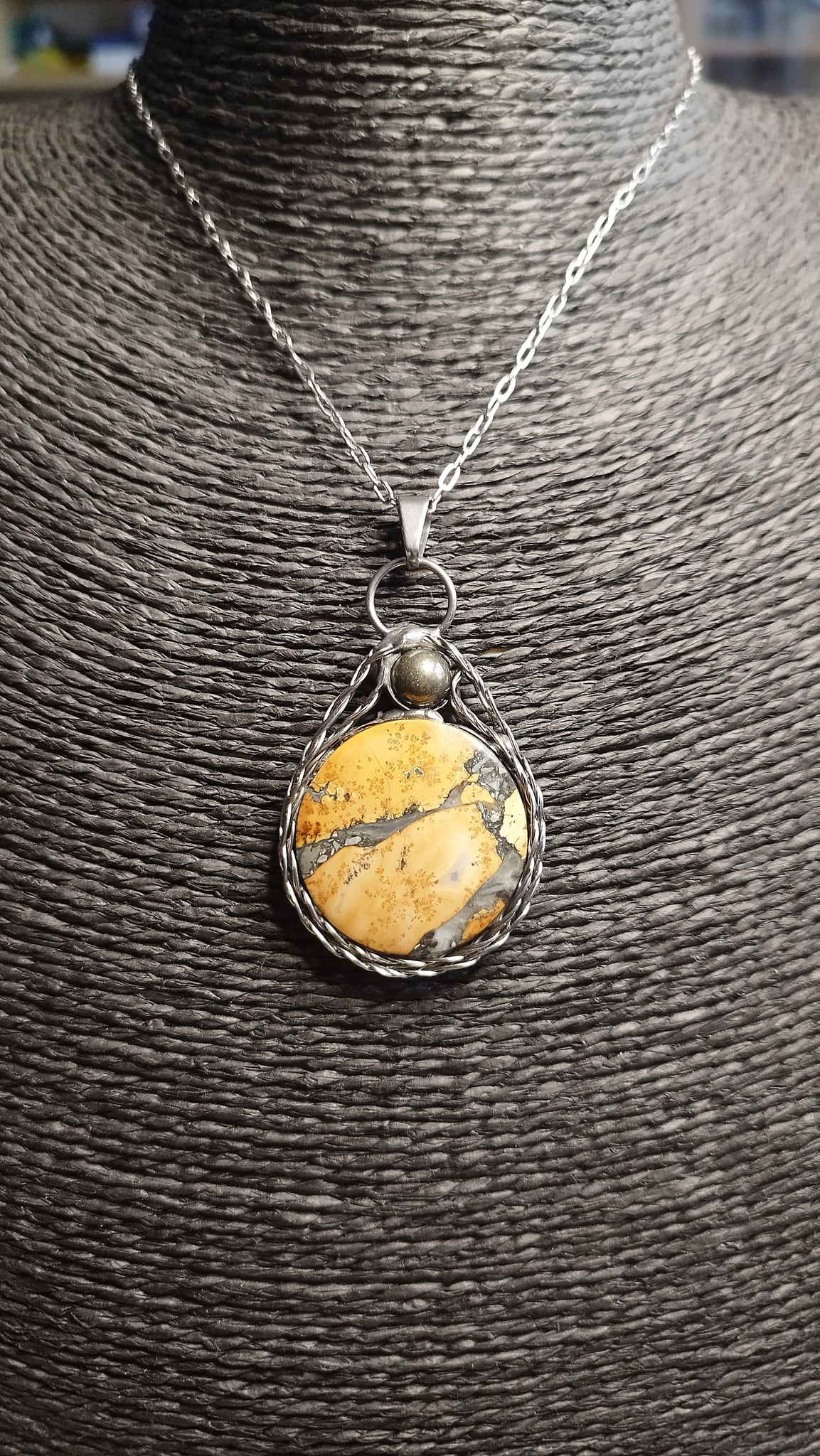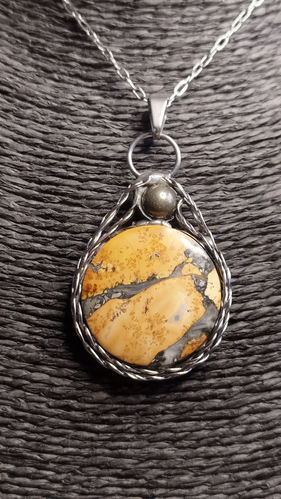 Tento okouzlující talisman zdobí vzácný jaspis Maligano pocházející z Indonésie. Tento kámen je známý svými nádhernými vzory a barevnými kontrasty, které připomínají malby přírody. V léčitelství je jaspis Maligano považován za kámen stability a rovnováhy. Pomáhá harmonizovat tělo i mysl, odstraňuje negativní energii a podporuje uzemnění. V esoterice se používá k ochraně před toxickými vlivy a k posílení vnitřní síly, odvahy a vytrvalosti. Je ideálním průvodcem při změnách a životních výzvách.