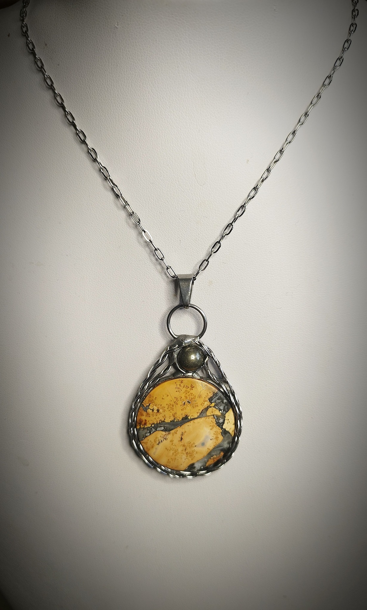 Doplněn o drobnou kuličku pyritu, tento talisman získává ještě silnější ochrannou energii. Pyrit je známý jako kámen bohatství a prosperity. V léčitelství posiluje sebevědomí, odstraňuje úzkosti a podporuje duševní jasnost. V esoterice slouží jako silný ochranný štít proti negativním energiím, chrání auru a přitahuje pozitivní vibrace. Navíc stimuluje kreativitu a motivaci, čímž podporuje osobní i profesní růst.