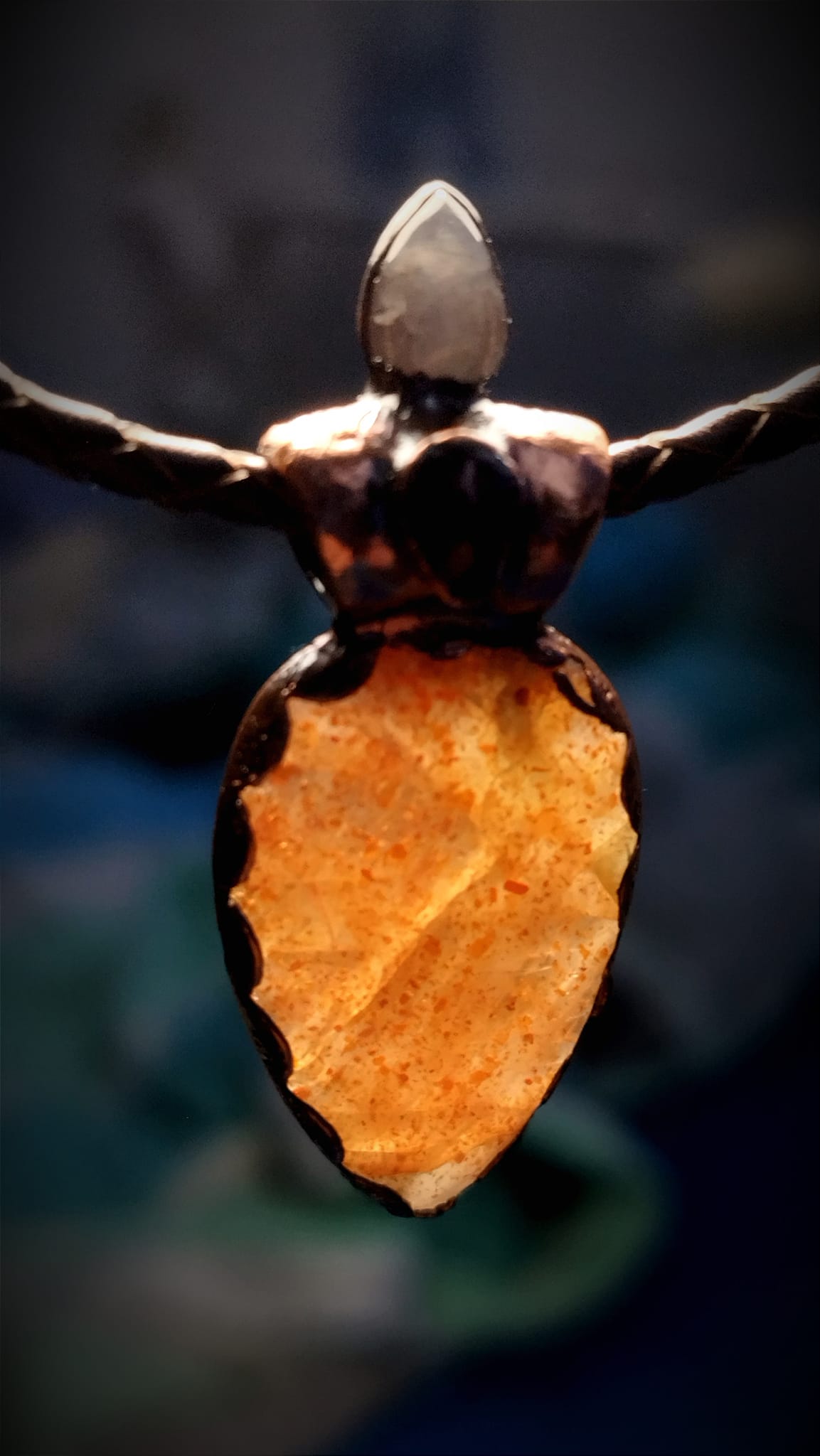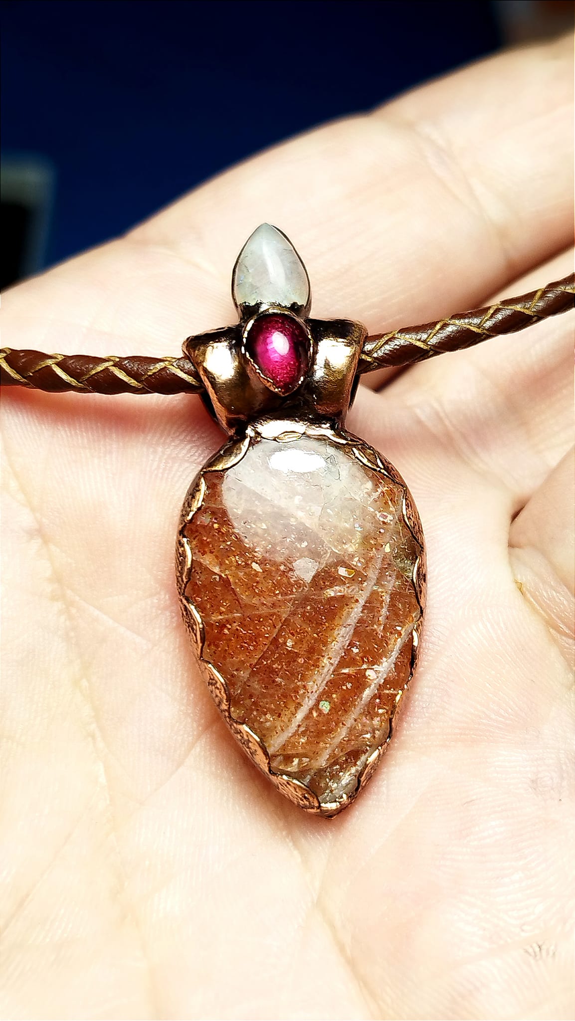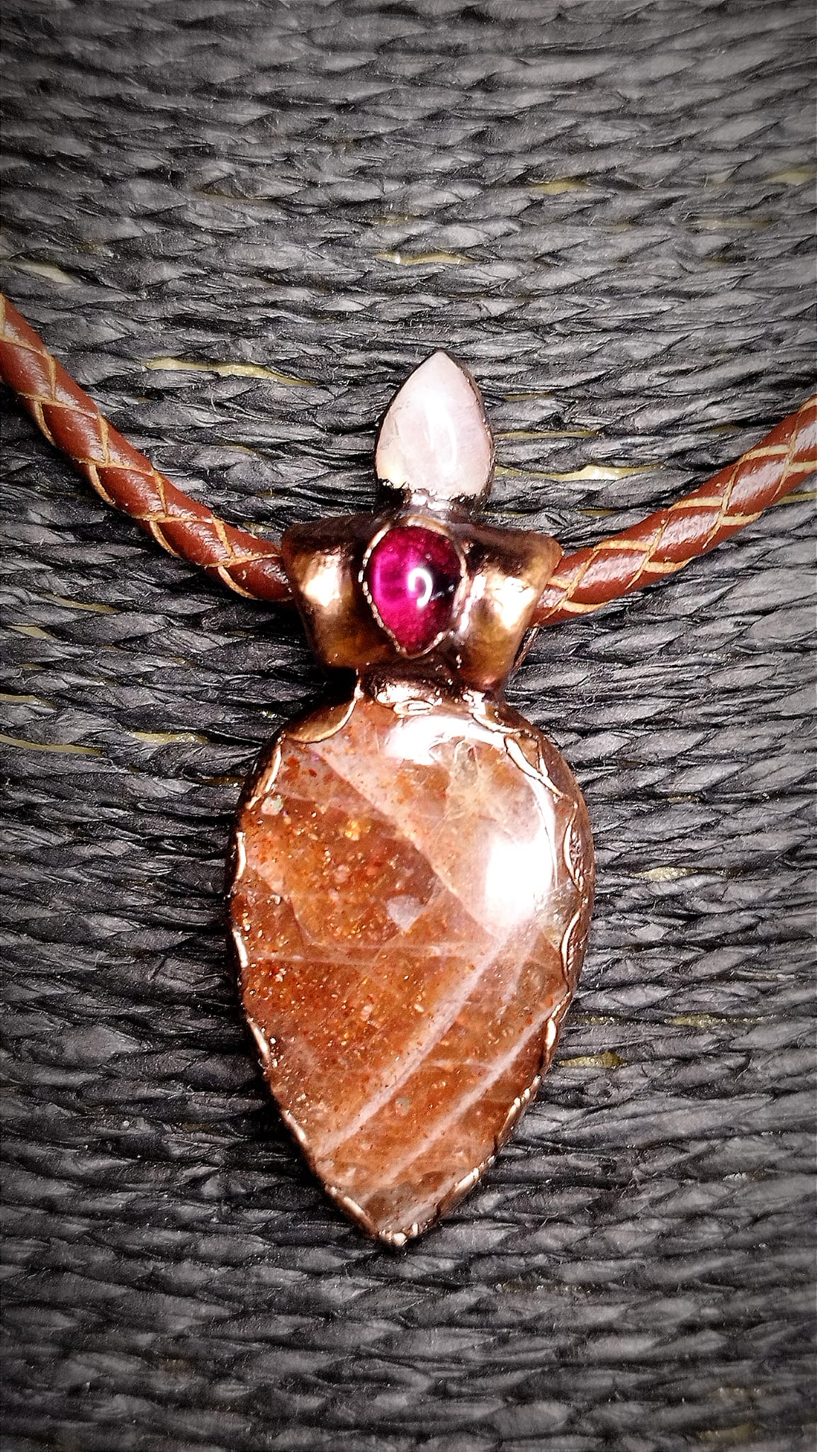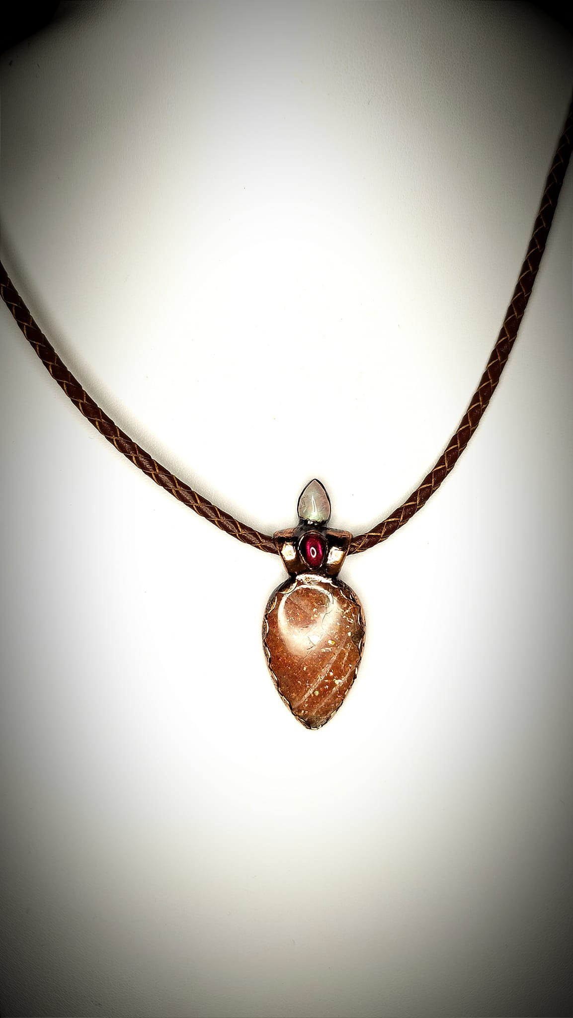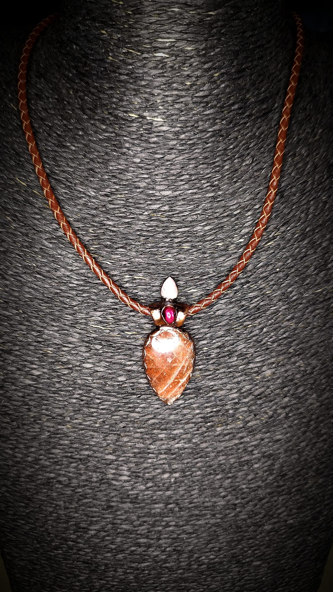 Zavěšen na pleteném řemínku z pravé kůže