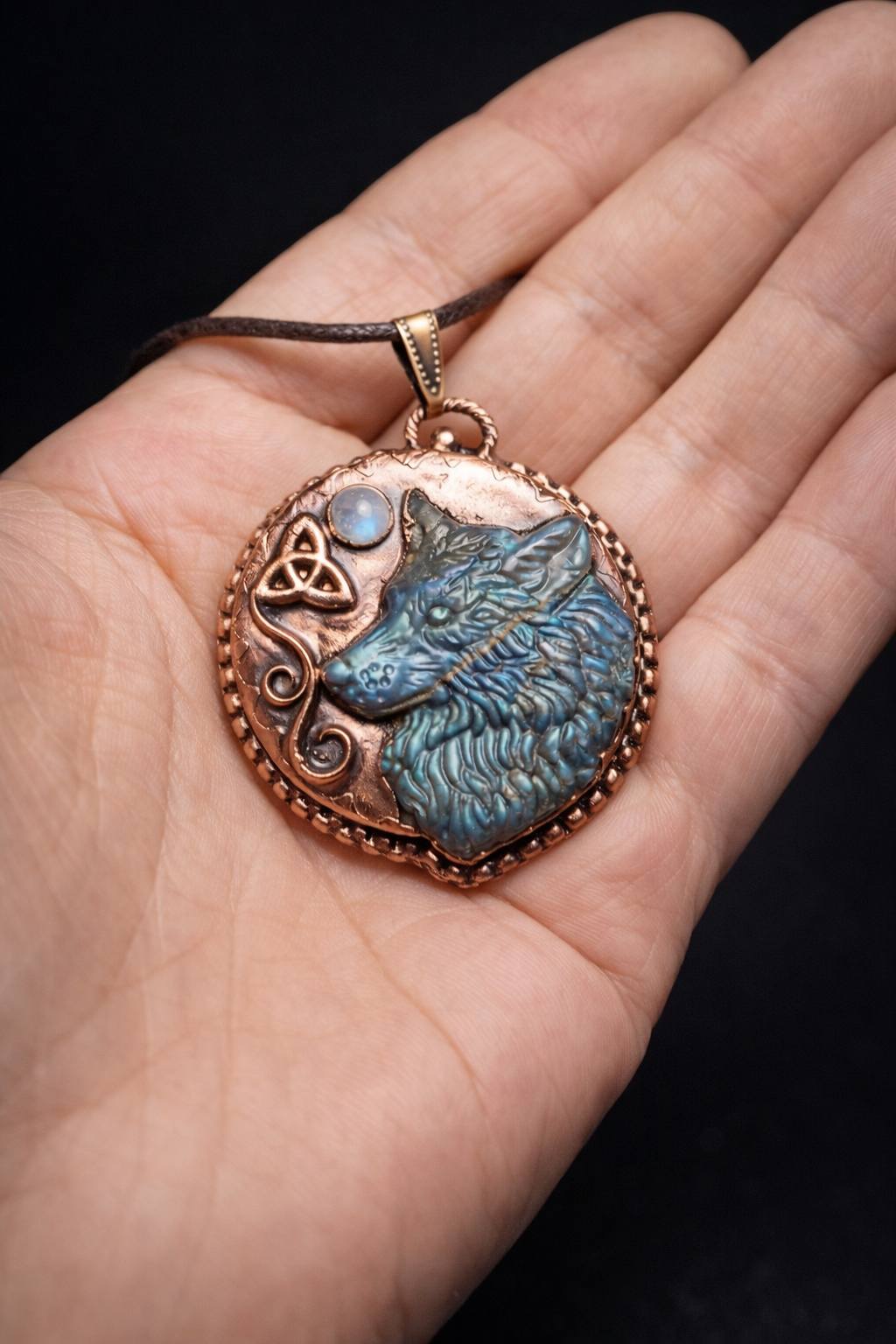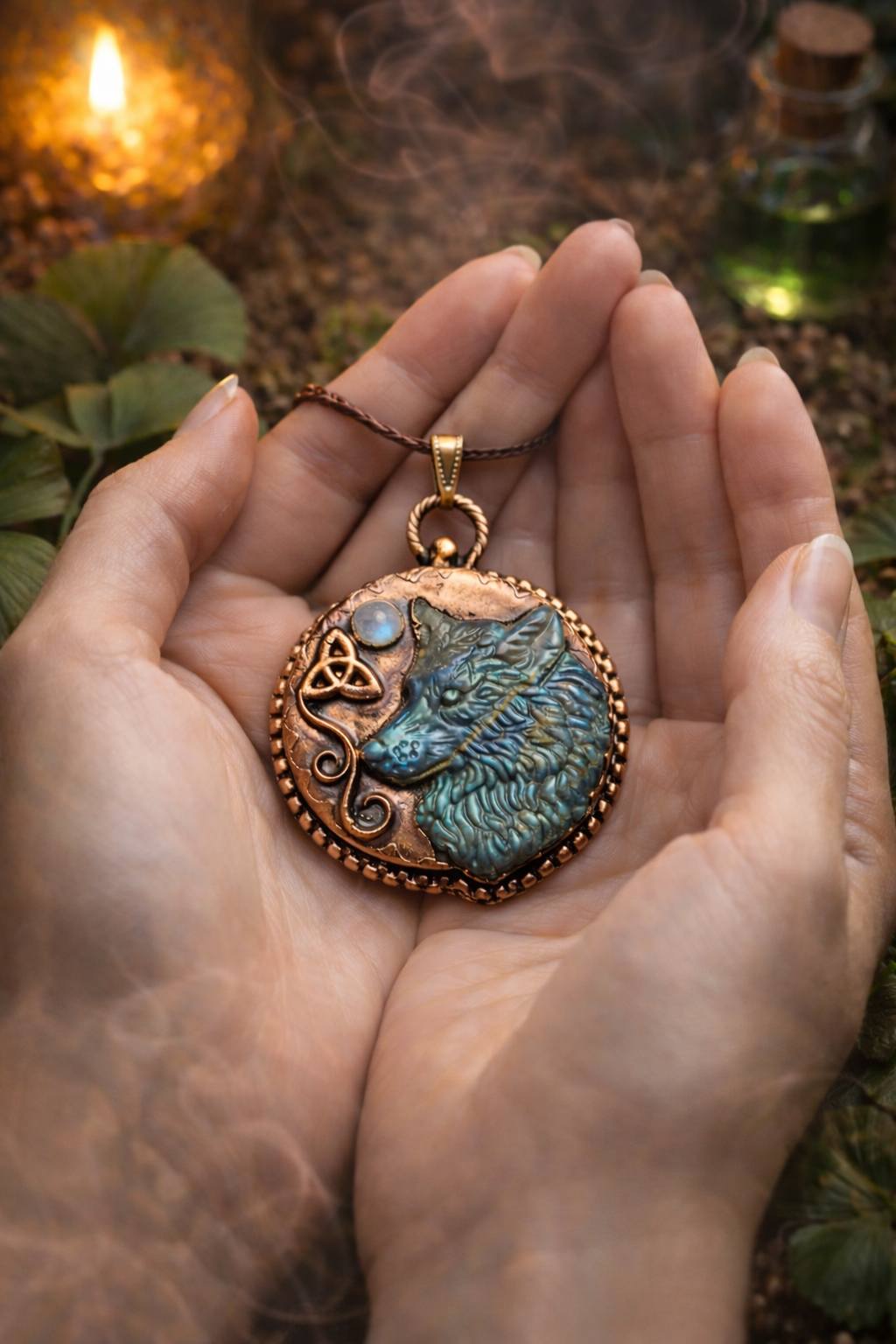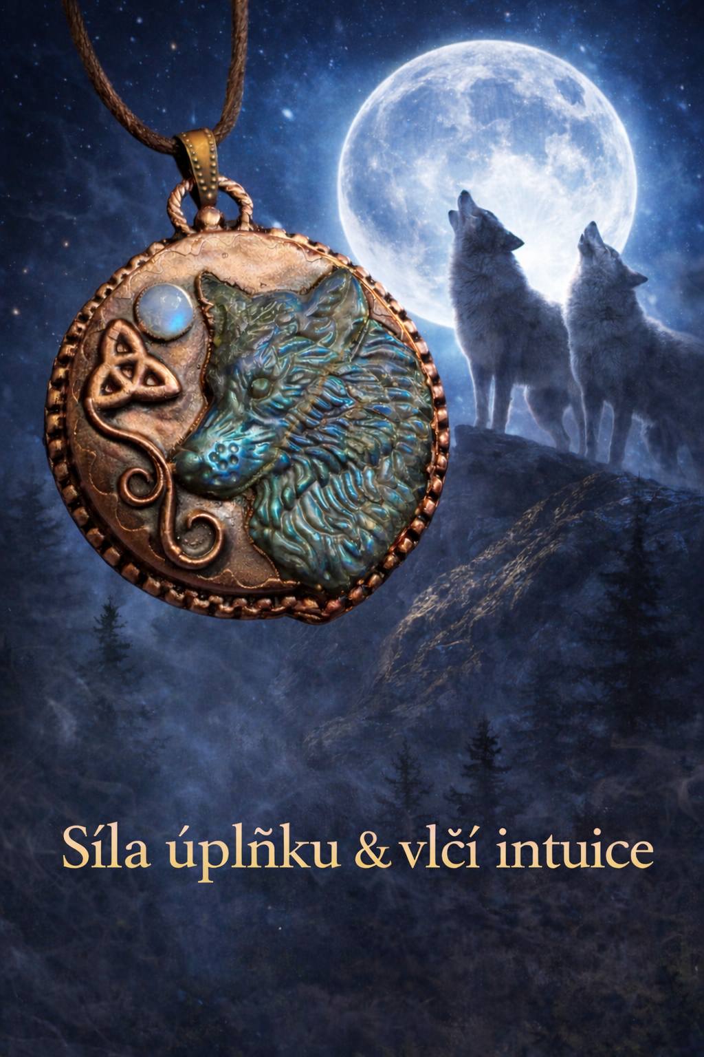 Zrodil jsem se z mědi 🧡, kovu, který vede energii Země 🌍 a propojuje tě s jejím pulsem. V mém středu dlí vlk z labradoritu 🐺🔮 – strážce tvých instinktů, průvodce mezi světy. Skrze jeho oči uvidíš to, co bylo skryté. Naučím tě důvěřovat tomu tichému hlasu v tobě, který vždy zná směr. 🌌