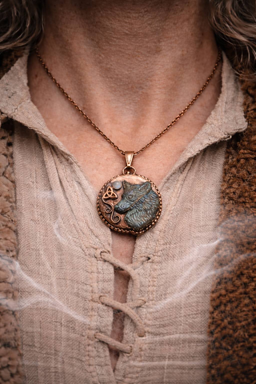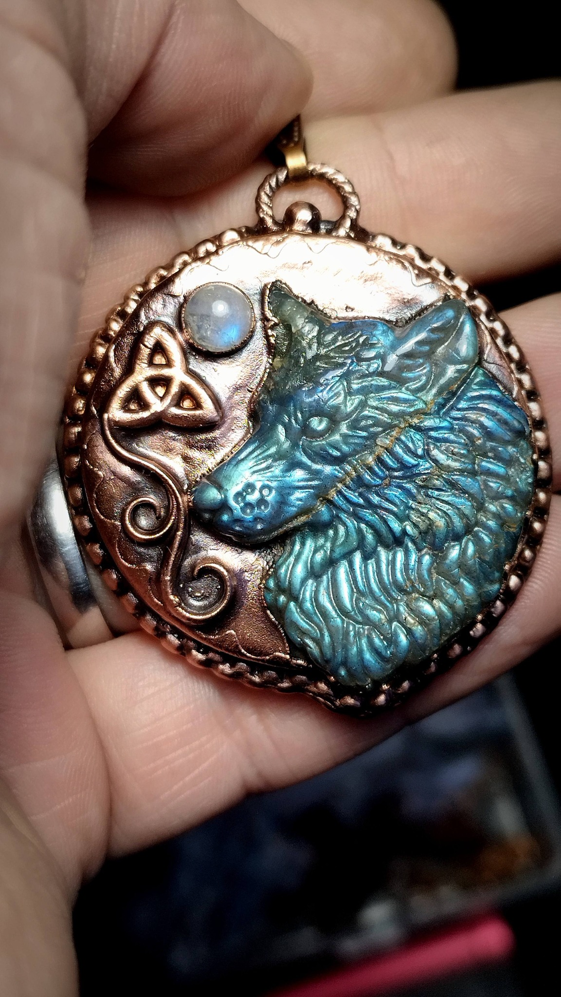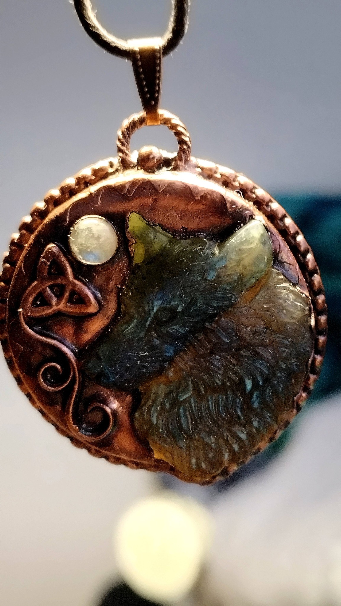 Zrodil jsem se z mědi 🧡, kovu, který vede energii Země 🌍 a propojuje tě s jejím pulsem. V mém středu dlí vlk z labradoritu 🐺🔮 – strážce tvých instinktů, průvodce mezi světy. Skrze jeho oči uvidíš to, co bylo skryté. Naučím tě důvěřovat tomu tichému hlasu v tobě, který vždy zná směr. 🌌