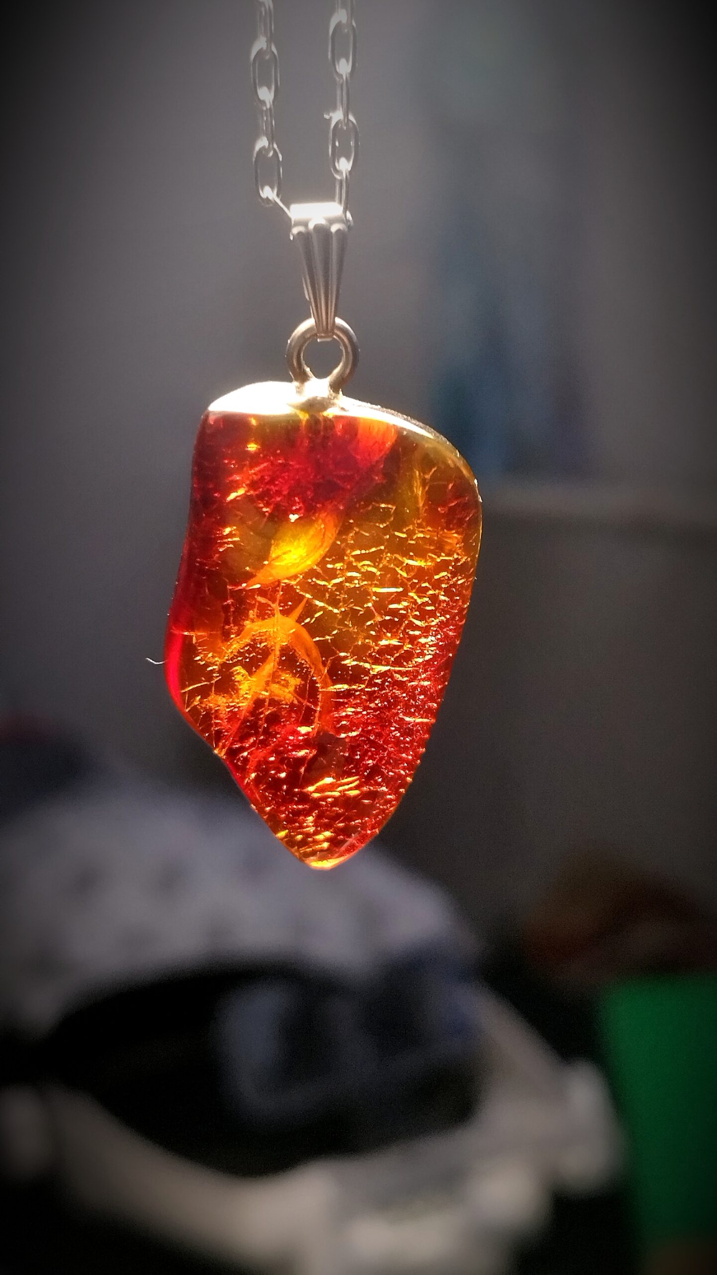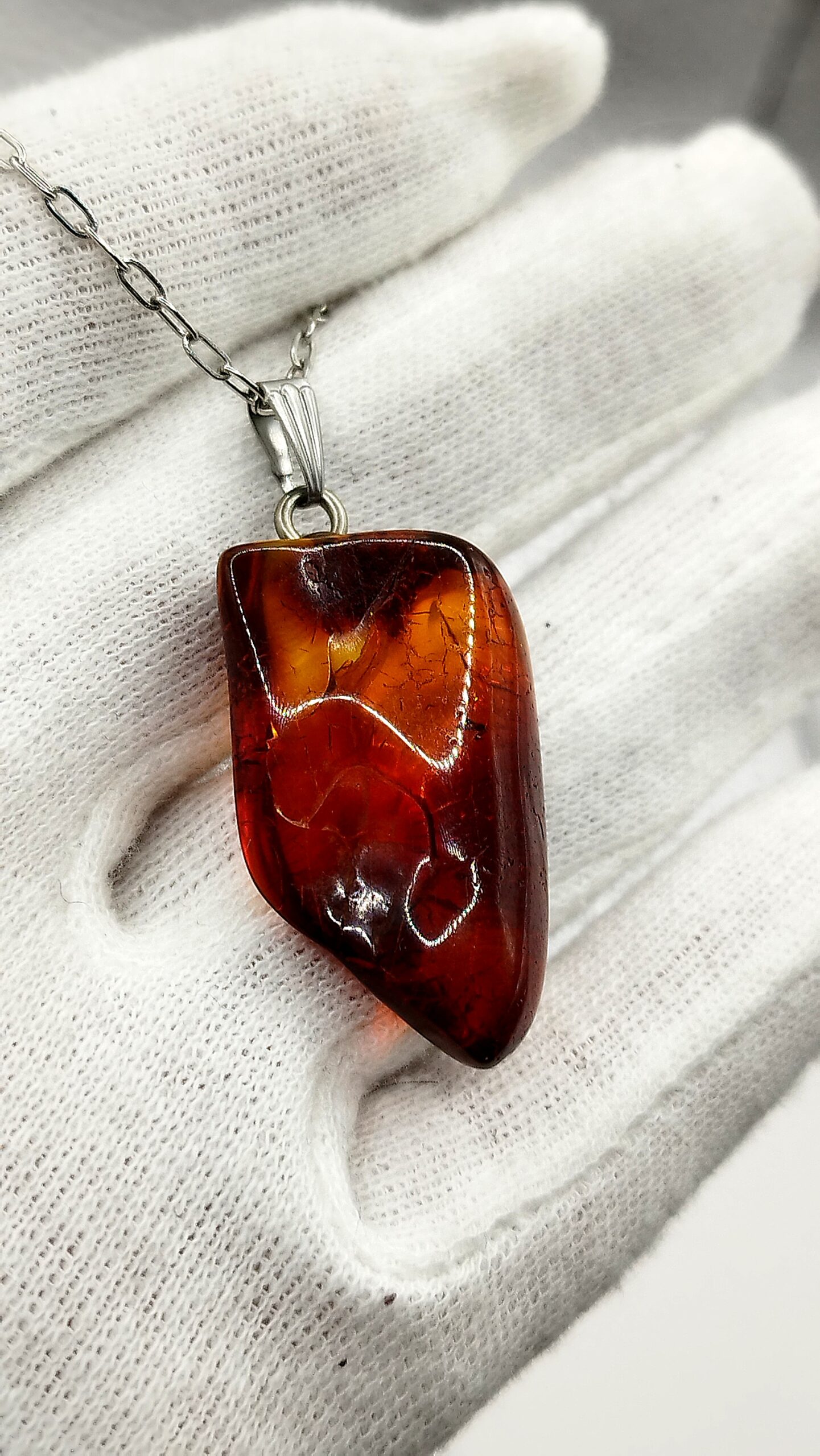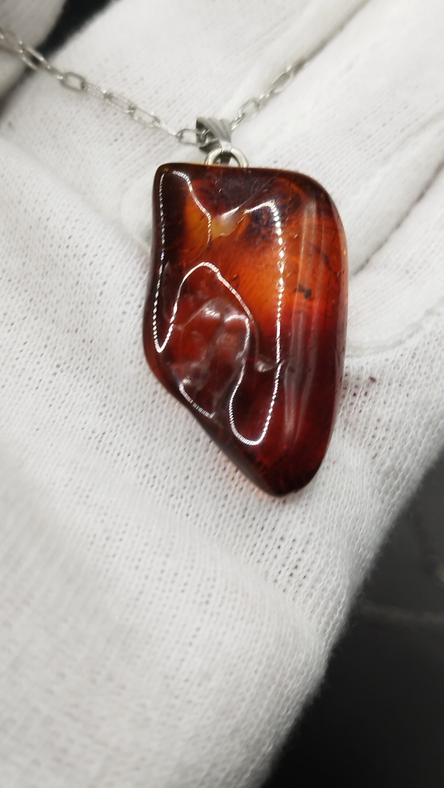 Elegantní přívěšek z pravého baltského jantaru v teplých odstínech červené, medové a zlatavé barvy 🔥🍯. Kámen je hladce leštěný a díky své průsvitnosti se na světle rozzáří jemnými ohnivými odlesky, které odhalují jeho přirozenou vnitřní kresbu. Každý kus je originál, vytvořený samotnou přírodou před desítkami milionů let 🌍.