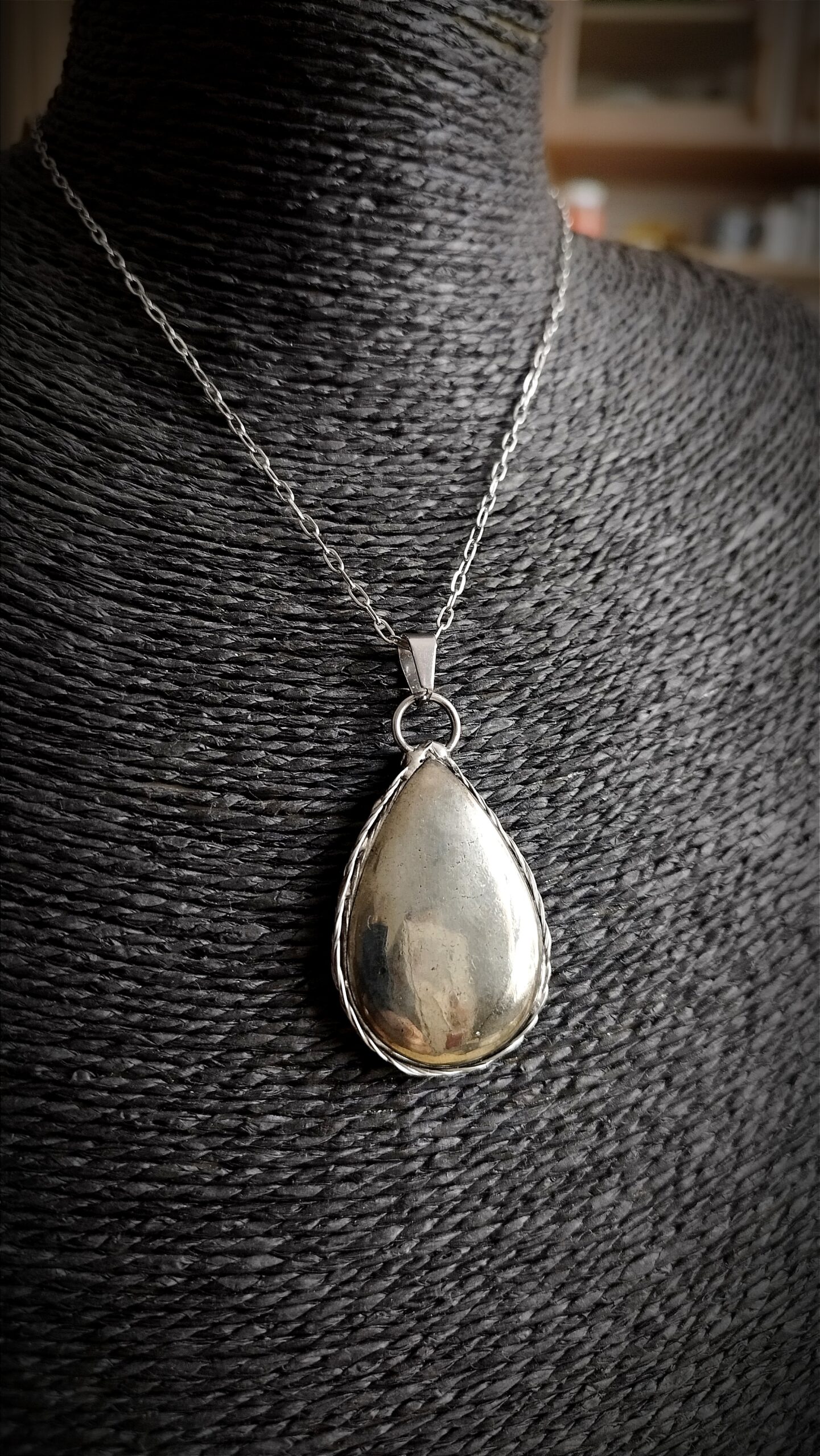 Tento šperk představuje jedinečný talisman s nádherně broušeným pyritem, zhotovený metodou Tiffany – cínování. Kombinuje chirurgickou ocel a cín s příměsí stříbra, přičemž neobsahuje olovo ani jiné těžké kovy, což zajišťuje jeho bezpečnost a kvalitu.